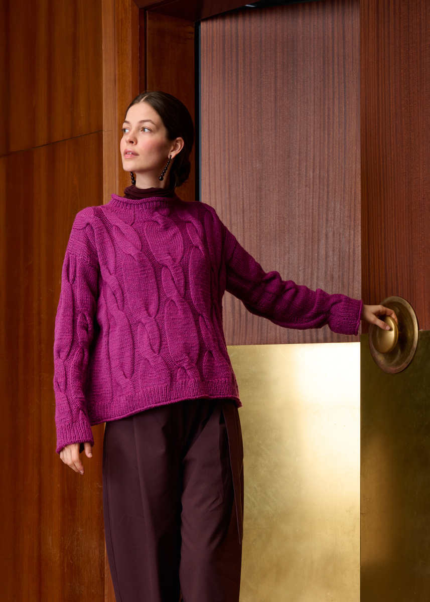 Lana Grossa Cool Merino (90% ren ny ull (merino ), 10% polyamid, løpelengde 150 m/50 g), 500 (550 – 600) g fuchsia (farge 2); strikkepinner nr. 5 og 5,5, 1 rundpinne nr. 5, 40 cm lang, såvel som 1 flettepinne.