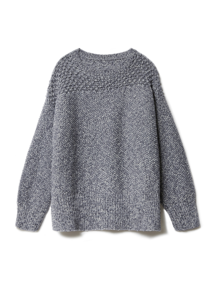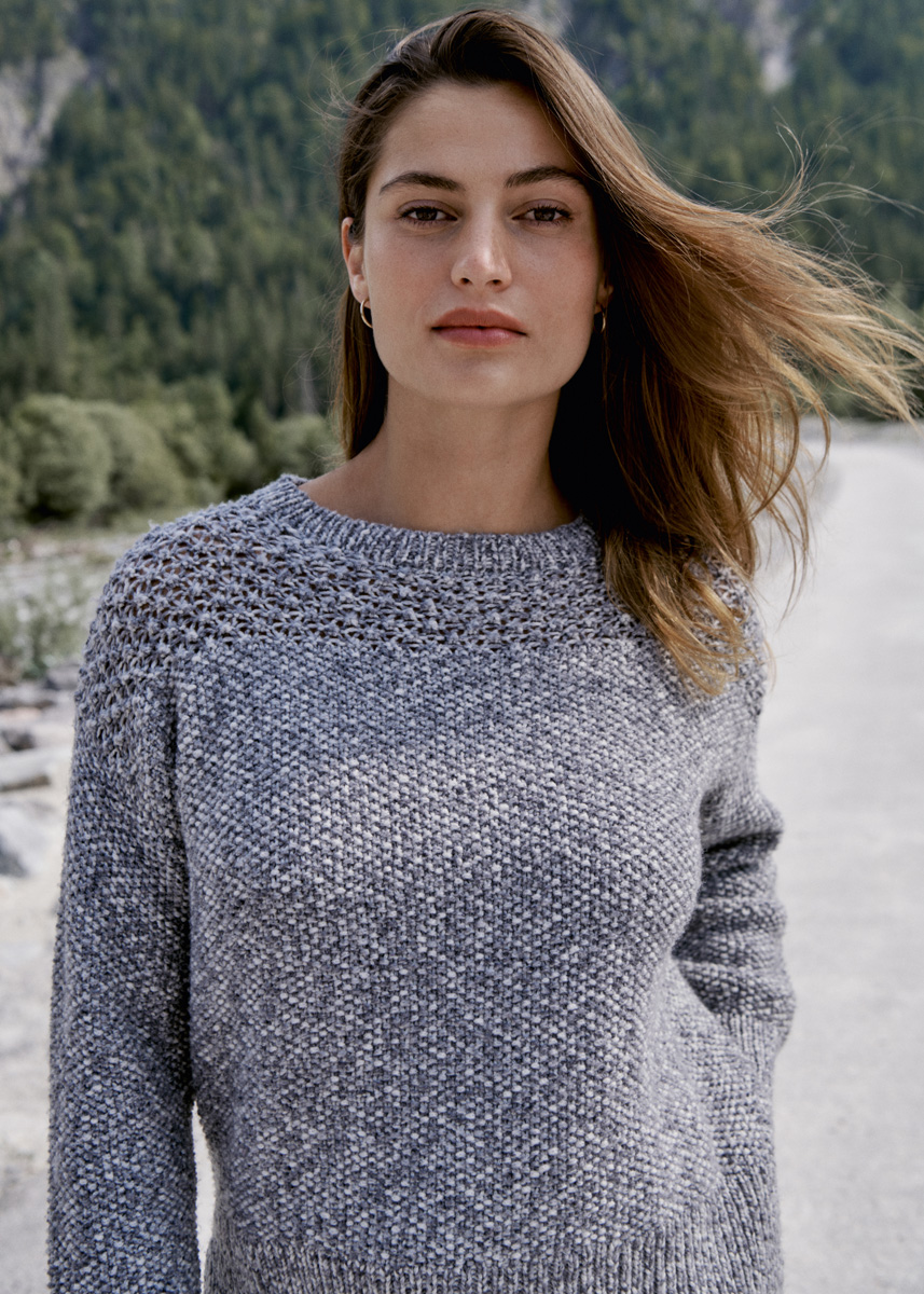 Lana Grossa „Cool Merino Print“ (90% ren ny ull (merino), 10% polyamid, löplängd = 150 m/50 g): 450 (500 - 550) g i råvit/mörk grå/ljus grå (färg 107); stickor nr. 5 och nr. 6, 1 rundsticka nr. 4,5, 40 cm lång.