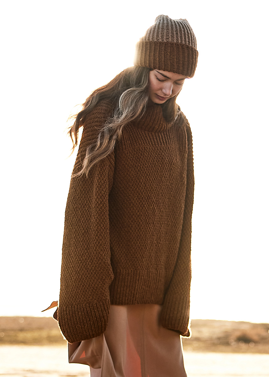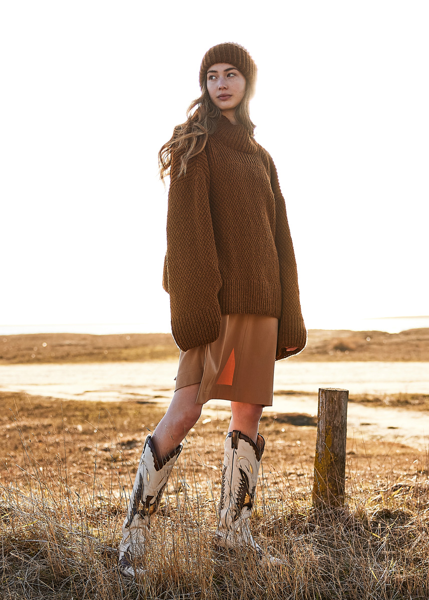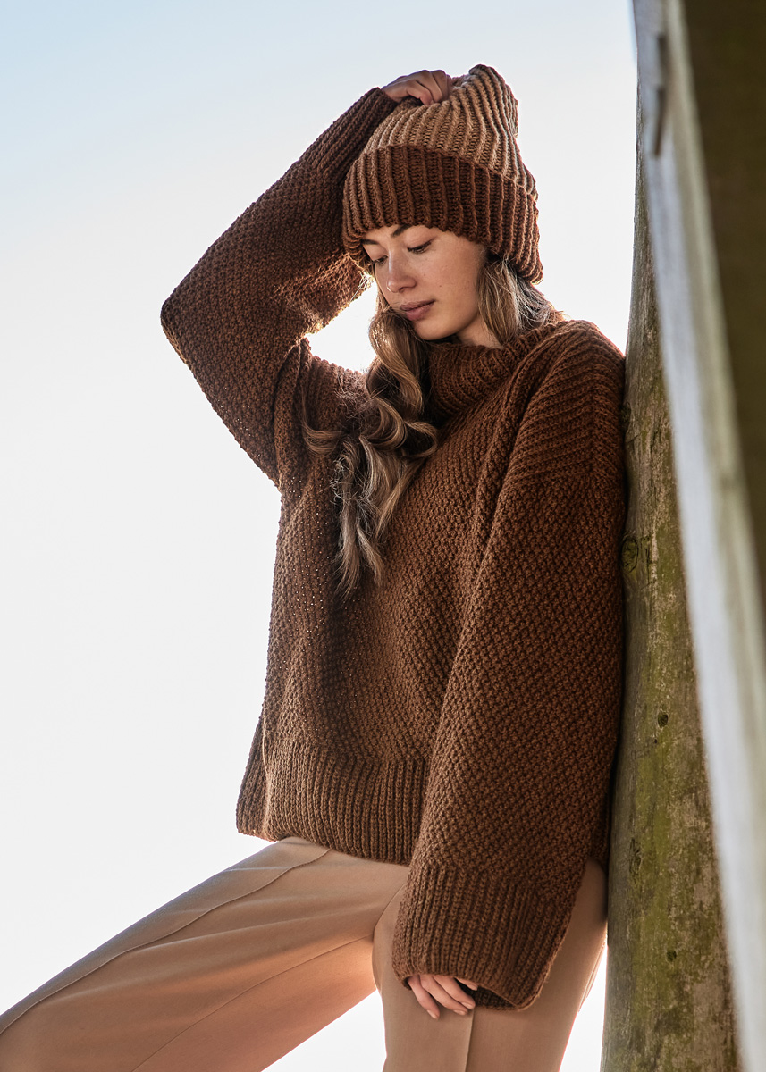Lana Grossa-kvalitet ”Cool Merino” (90 % ren ny (merino), 10 % polyamid, løbelængde = ca. 150 m / 50 gr.): 550(600-650) gr nougat (fv 9), strikkepinde nr. 5 og 5½, en kort rundpind nr. 5.
