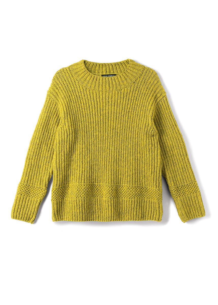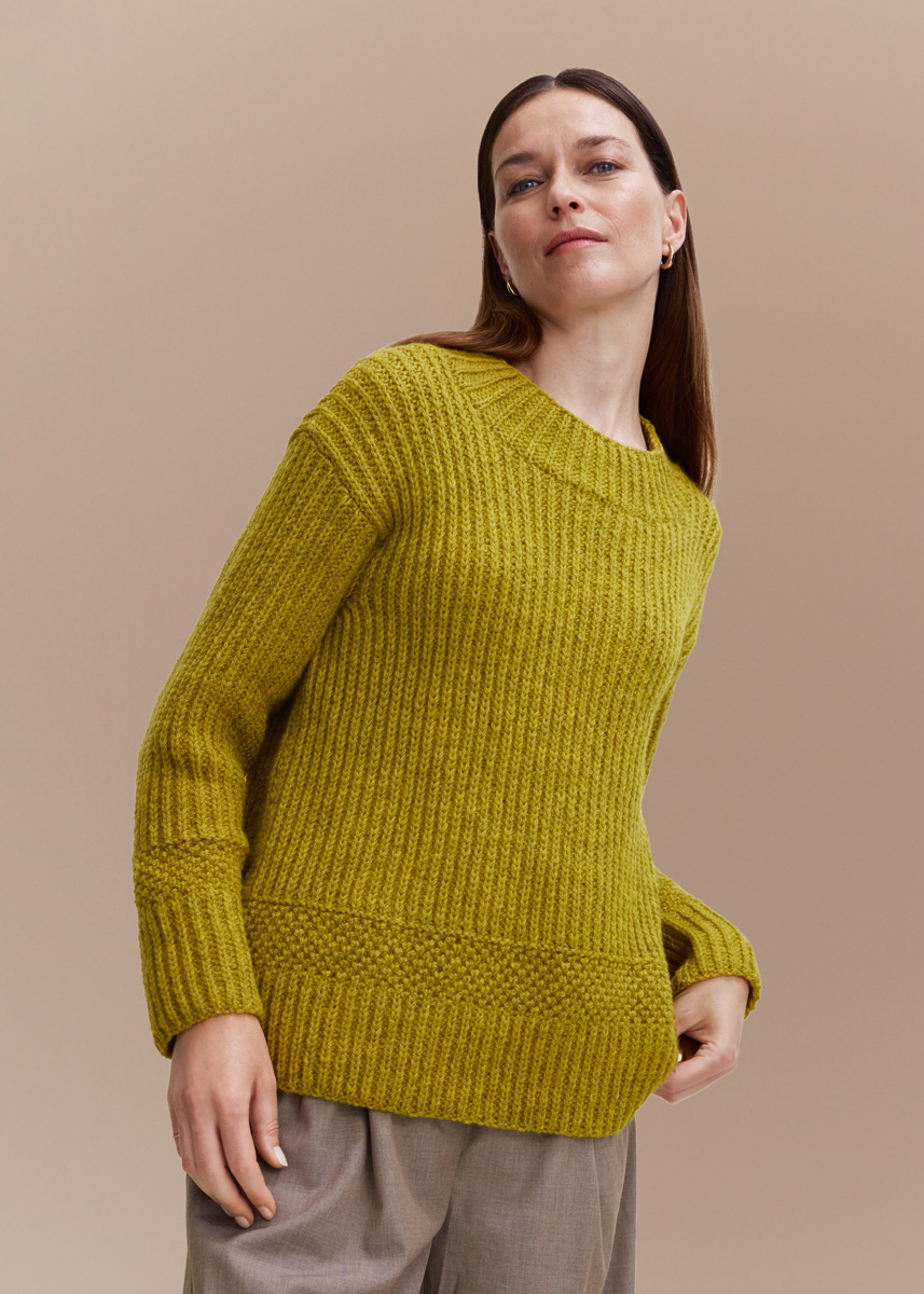Lana Grossa-kvalitet ”Cool Merino” (90 % ren ny uld (merino), 10 % polyamid, løbelængde = ca. 150 m / 50 gr): ca. 550 (600 – 650 – 700) gr lime (fv 33), strikkepinde nr. 5, en kort rundpind nr. 5.