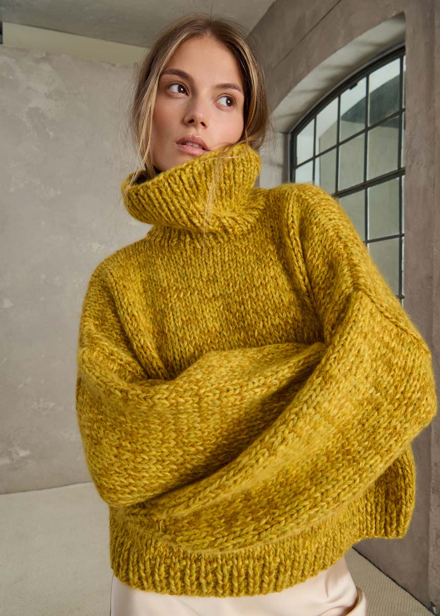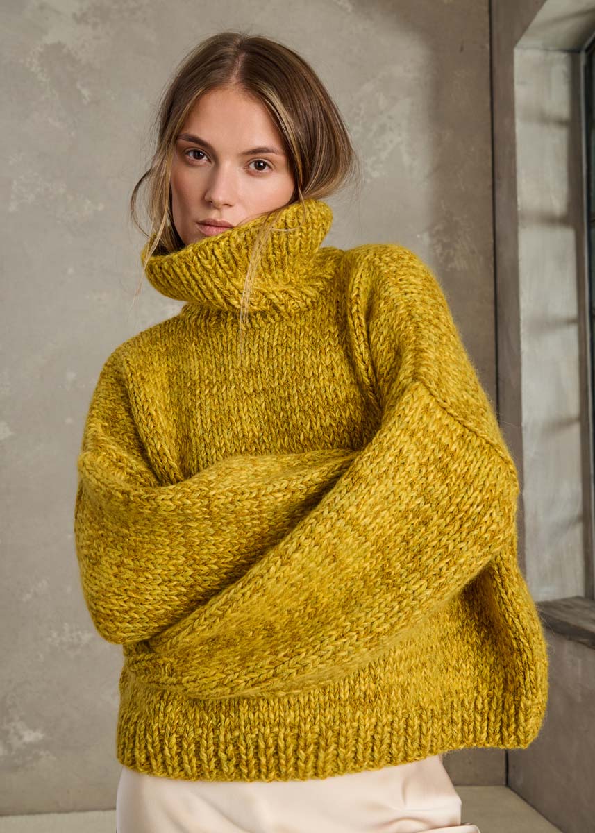 Lana Grossa „Cool merino“ (90% ren ny ull (merino), 10% polyamid, löplängd= ca. 150 m/50 g): ca. 300 (300 – 350) g Limette (färg 33) „Superkid Seta“ (65% mohair (superkid), 35% silke, löplängd= ca. 100 m/25 g): ca. 225 (225 – 250) g gul (färg 14) „Alta Moda Alpaca“ (90% alpacka (baby), 5% ren ny ull (merino), 5% polyamid, löplängd= ca. 140 m/50 g): ca. 350 (350 – 400) g senapsgul (färg 96), stickor nr. 8 och nr. 9; en rundsticka nr. 8, längd 40 cm