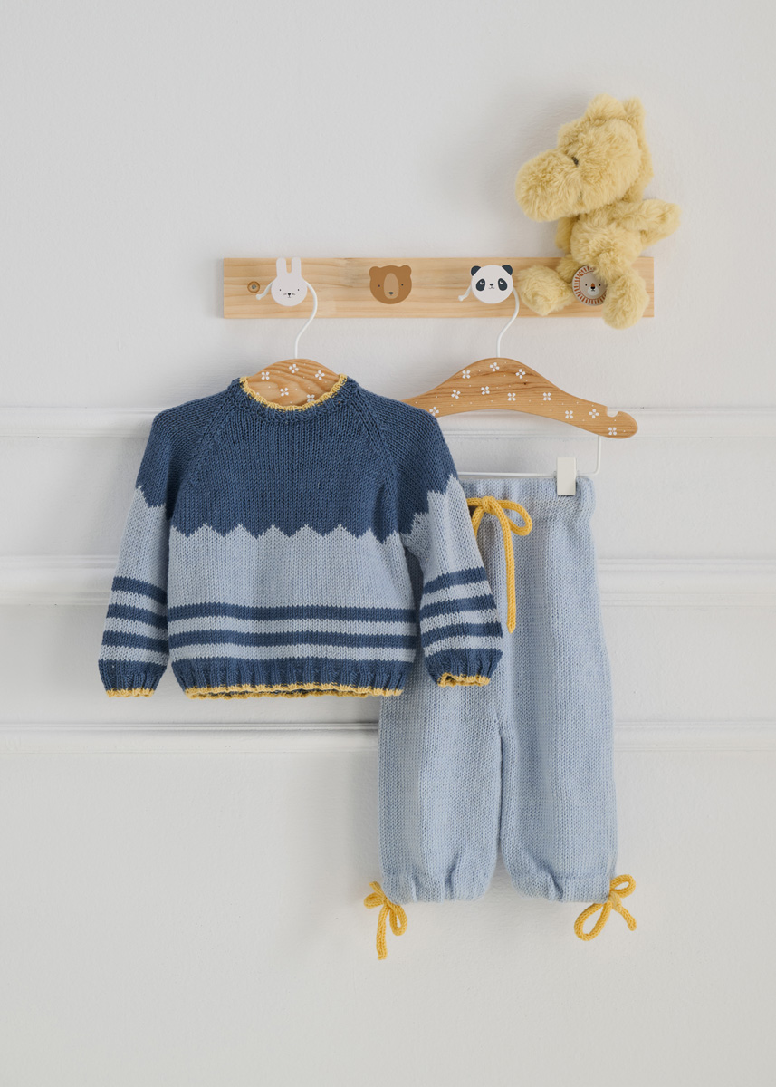 Lana Grossa Cool Wool Baby (100% ren ny ull (merino extrafine); løpelengde = 220 m/50 g): 50 (50/100/100) g dueblå (farge 263) og 50 g hver i lysblå (farge 208) og gul (farge 273); rundpinner nr. 2,5 og 3; maskemarkører [MM]; 3 trykknapper med 7 mm diameter.