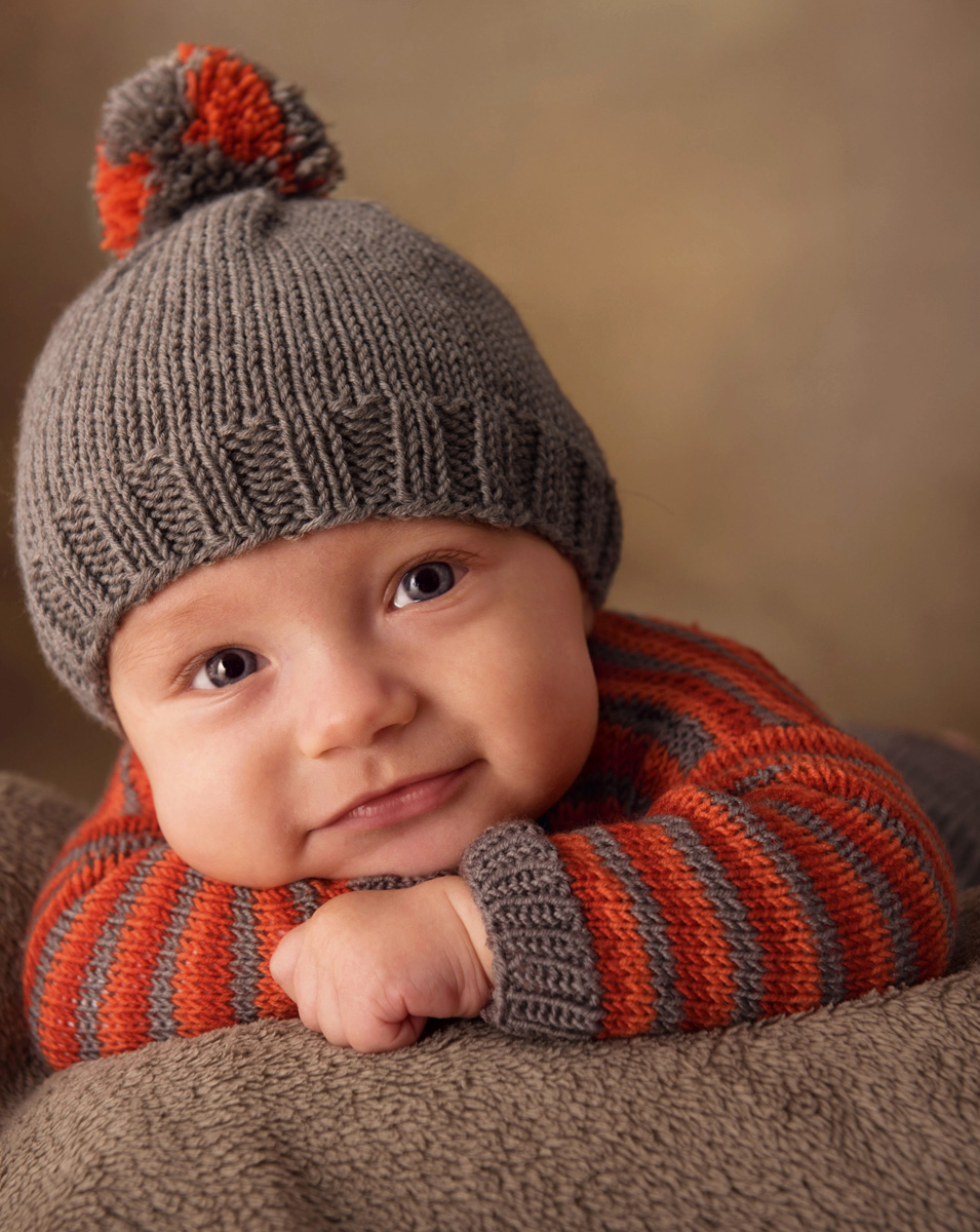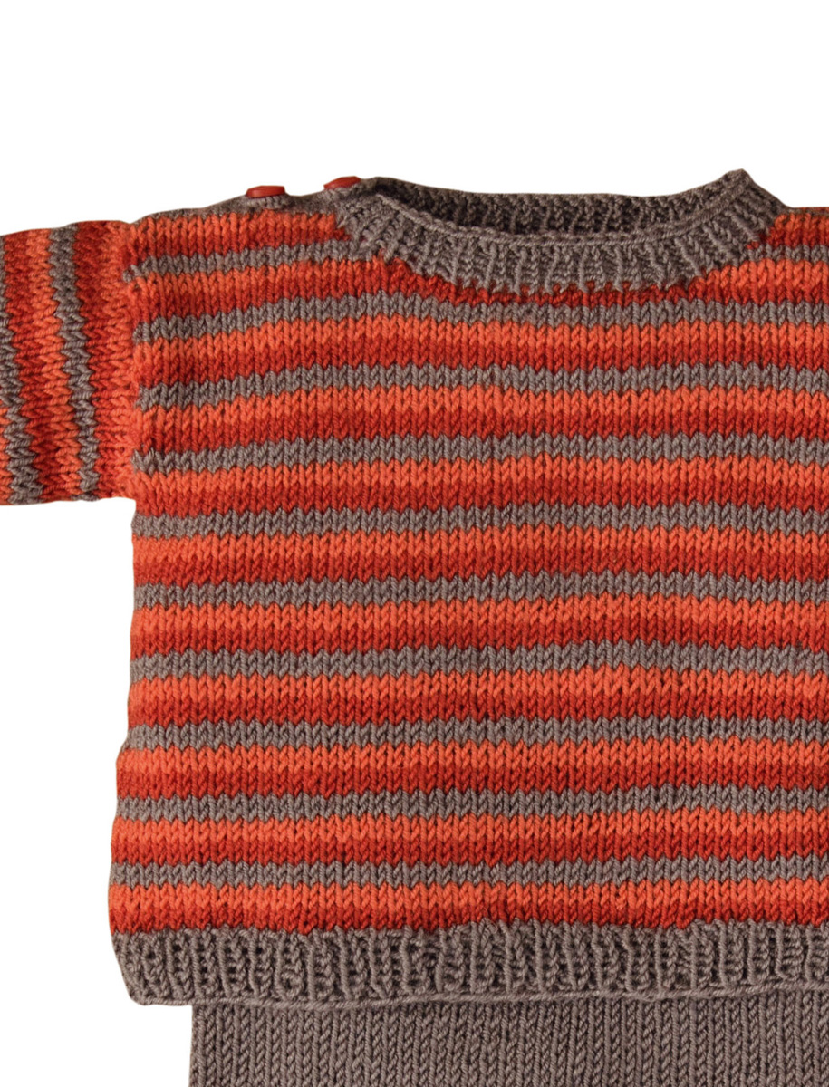 Lana Grossa-kvalitet ”Cool Wool Baby” (100 % ren ny uld, l.bel.ngde = ca. 220 m/50 gr.): 50 gr grabrun (fv 211), 50 gr koral (fv 270) og 50 gr tomatrod (fv 271), strikkepinde nr. 3., rundpind nr. 3., 40 cm, h.klen.l nr. 3, 2 knapper med en diameter p. 10 mm
