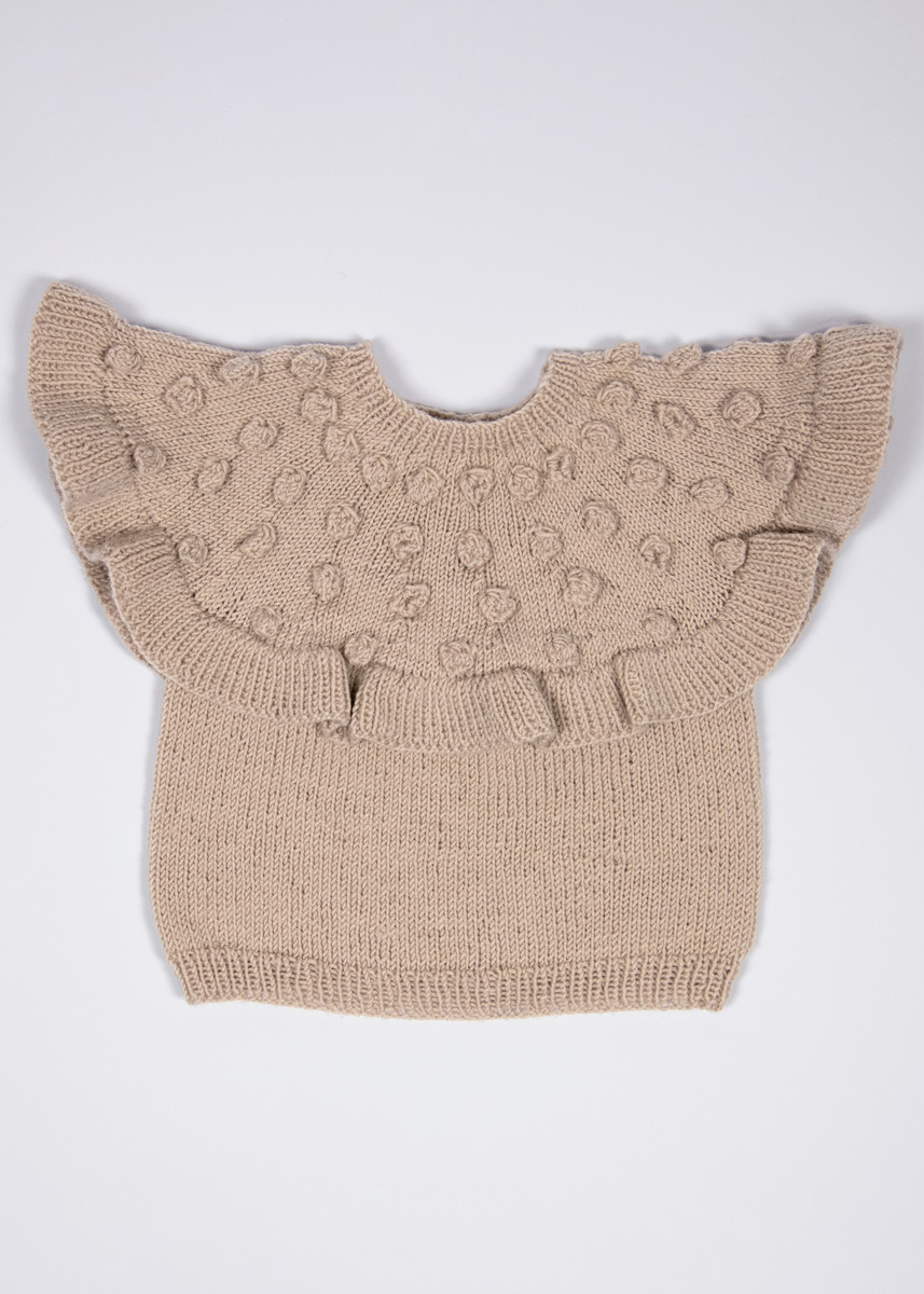 Lana Grossa-kvalitet ”Cool Wool Baby” (100 % ren ny uld, løbelængde = ca. 220 m / 50 gr.): 100(100-150- 150) gr beige (fv 212), rundpind nr. 2½ og 3, 40 cm, hæklenål nr. 2½, 1 knap 14 mm Ø.