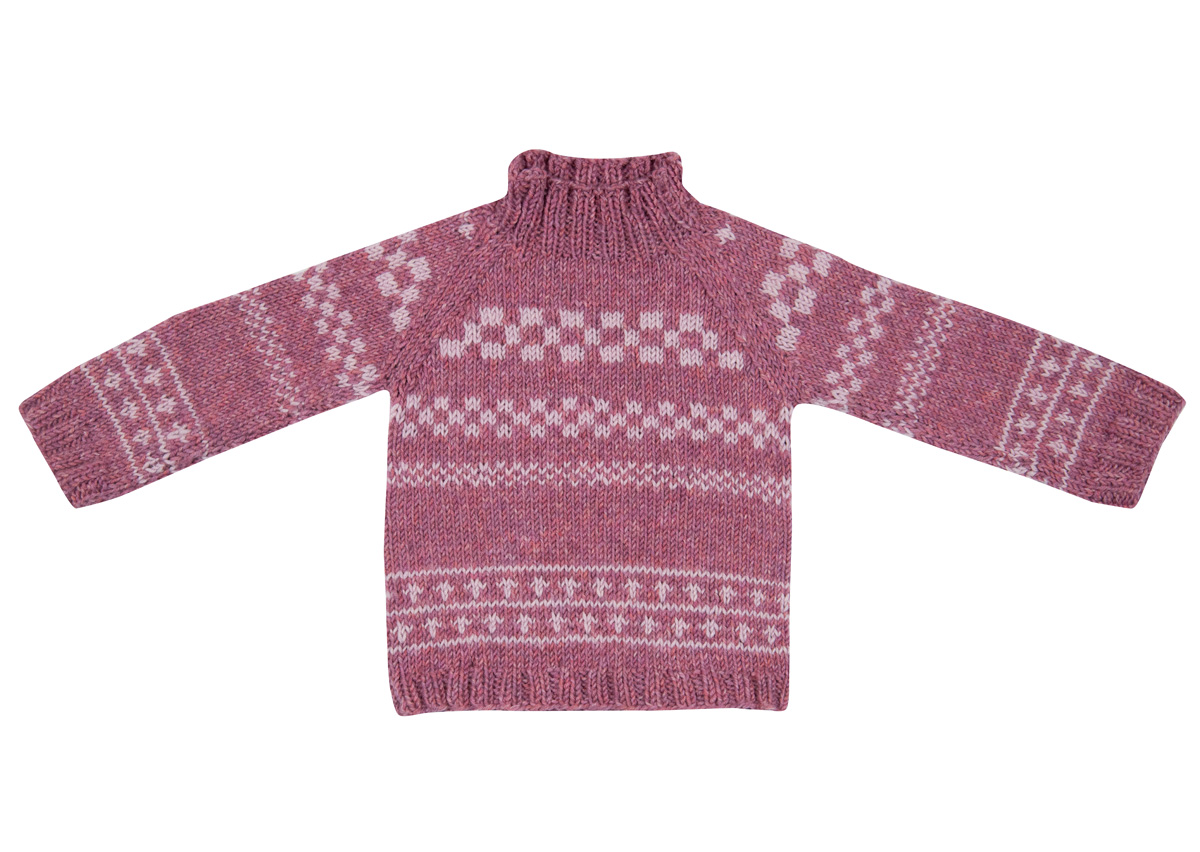 Lana Grossa-kvalitet ”Cool Wool Big Mélange” (100 % ren ny uld, løbelængde = ca. 120 m / 50 gr.): 100(150- 150-200) gr bær meleret (fv 218) og 50(50-100-100) gr syrinrosa meleret (fv 217), strikkepinde nr. 4½, rundpind nr. 4½, 40 cm, strømpepinde nr. 4½