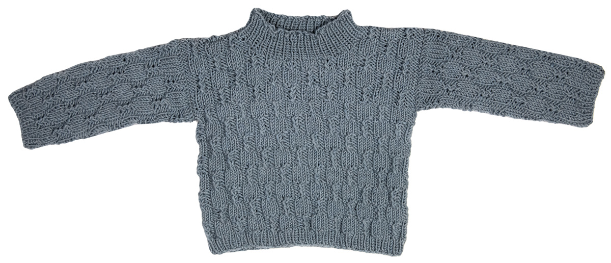 Lana Grossa-kvalitet ”Cool Wool Big Mélange” (100 % ren ny uld, løbelængde = ca. 120 m / 50 gr.): 150(200- 250) gr gråblå meleret (fv 210), strikkepinde nr. 4½, rundpind nr. 4½, 40 cm.