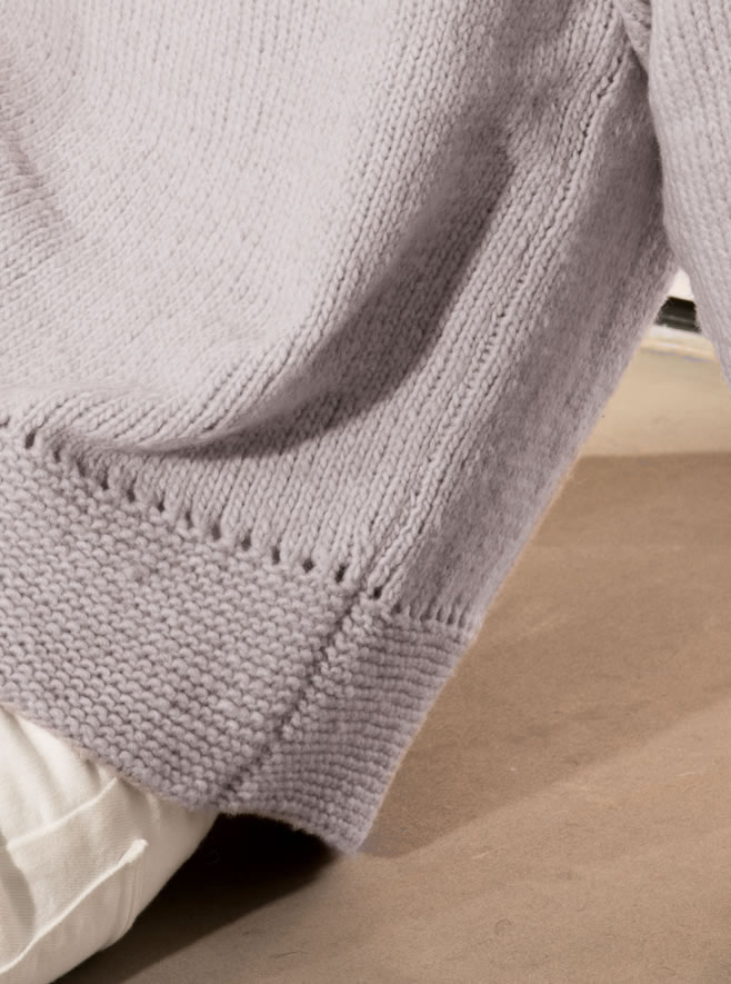 Lana Grossa-kvalitet ”Cool Wool Big” (100 % ren ny uld, løbelængde = ca. 120 m / 50 gr.): ca. 550 (600/650) gr. lys lilla (fv. 948), strikkepinde nr. 4, rundpind nr. 4, 40 cm.