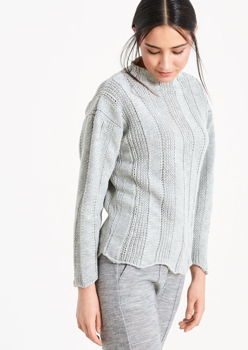 Lana Grossa-kvalitet ”Cool Wool Big” (100 % ren ny uld, løbelængde = ca. 120 m / 50 gr.): 550(600-650) gr lysegrå meleret (fv 616), strikkepinde nr. 4½, rundpind nr. 4½, 40 cm.