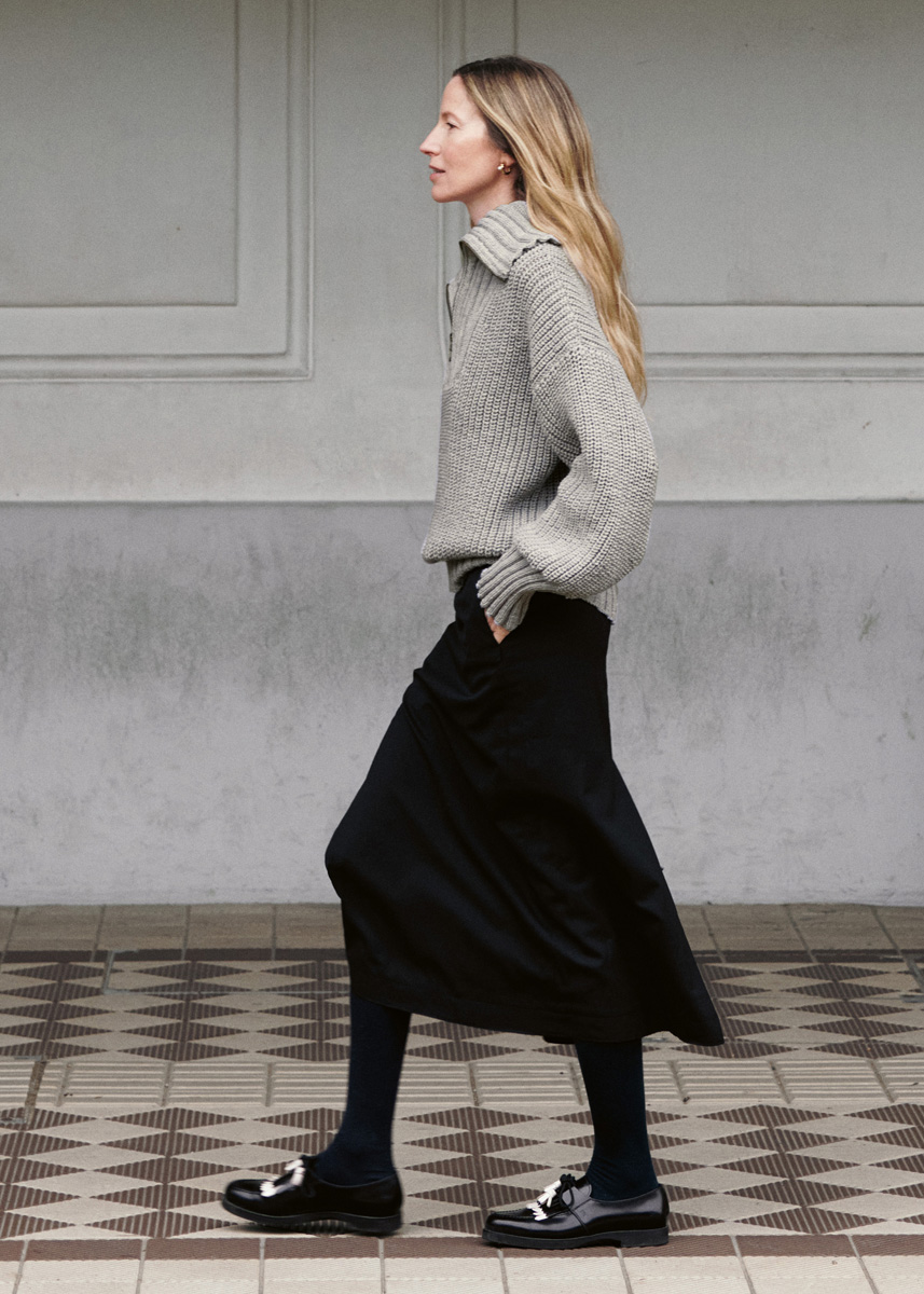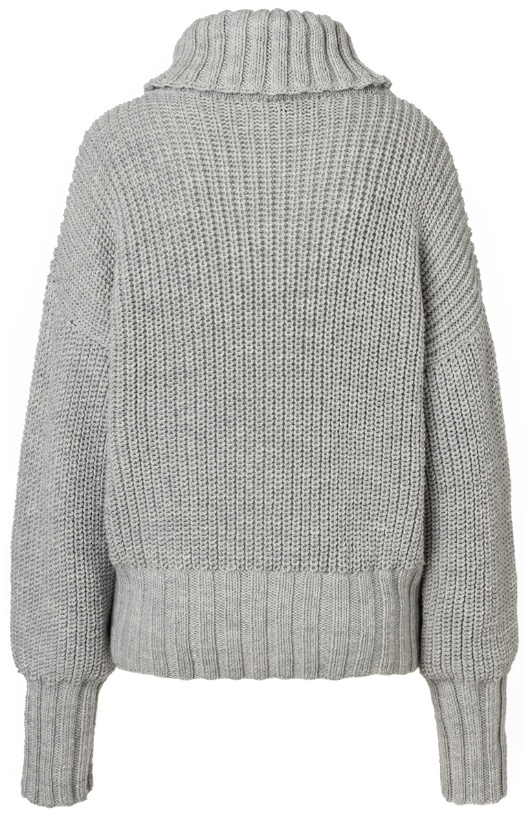 Lana Grossa Cool Wool Big Mélange (100% ren ny ull (extrafin merino), löplängd 120 m/50 g), 900 (950 – 1000) g ljus grå melerad (färg 616); stickor nr. 4, 4,5 och 5, 1 blixtlås från YKK, metall, ljus grå, 40 cm lång.
