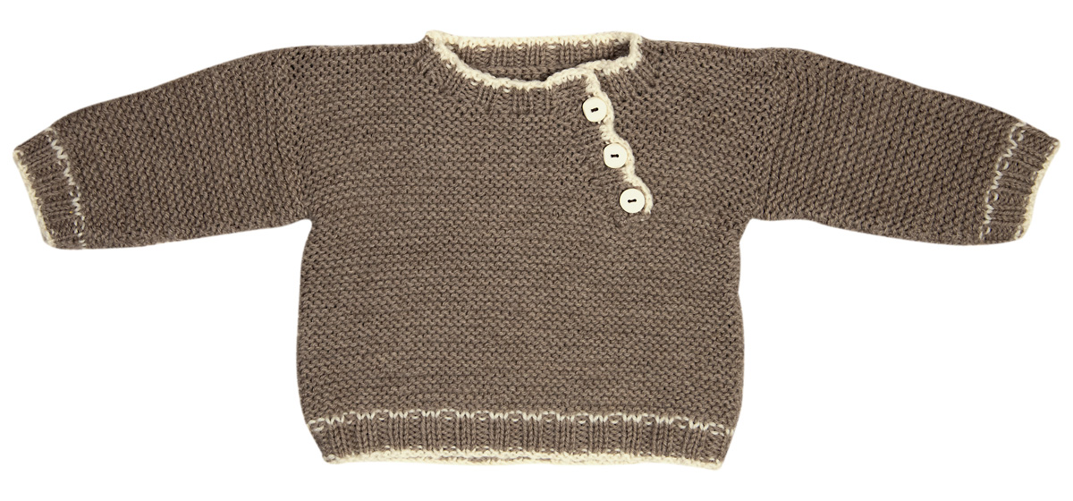 Lana Grossa-kvalitet ”Cool Wool Cashmere” (90 % ren ny uld (ekstrafin merino), 10 % cashmere, løbelængde = ca. 160 m / 50 gr.): 100(150-150) gr taupe (fv 6) og 50 gr råhvid (fv 12), strikkepinde nr. 4, rundpind nr. 4, 40 cm, hæklenål nr. 3½, 3 knapper 15 mm Ø.