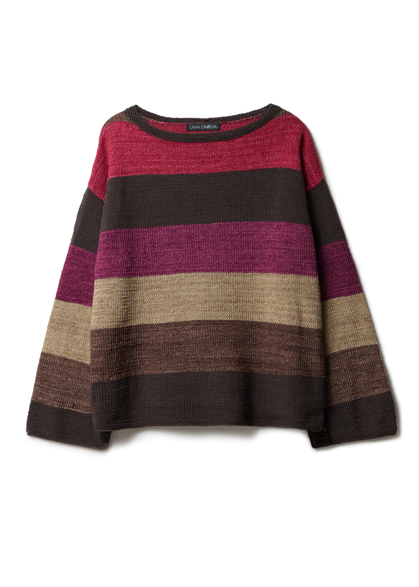 Lana Grossa Cool Wool (100% ren ny ull (extrafin merino), löplängd 160 m/50 g), 200 (250 – 250) g svartbrun (färg 2113) och Lana Grossa Cool Wool Vintage (100% ren ny ull (extrafin merino), löplängd 160 m/50 g), 100 (150 – 150) g plommon (färg 7365), 100 (150 – 150) g sandbeige (färg 7382), 100 (150 – 150) g mörkbrun (färg 7384) och 100 (150 – 150) g indisk röd (färg 7377); stickor nr. 3 och 3,5, samt 1 rundsticka nr. 3, 40 cm lång.