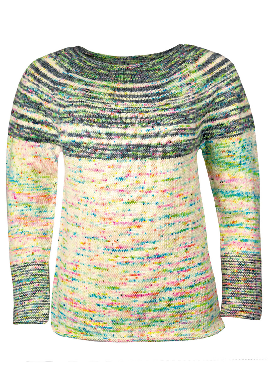 Lana Grossa Cool Wool hand-dyed (100% ren ny ull, löplängd 320 m/100 g), 300 (400 – 500) g råvit/neongul/pink/turkos/oliv (färg 103) och 200 g mellan-/mörk grå/rosa/pink/turkos/orange (färg 105); 1 rundsticka nr. 3, 40 cm lång, rundsticka nr. 3,5, 40, 60 och 80 cm långa, 1 strumpstickor nr. 3,5, 4 maskmarkörer.