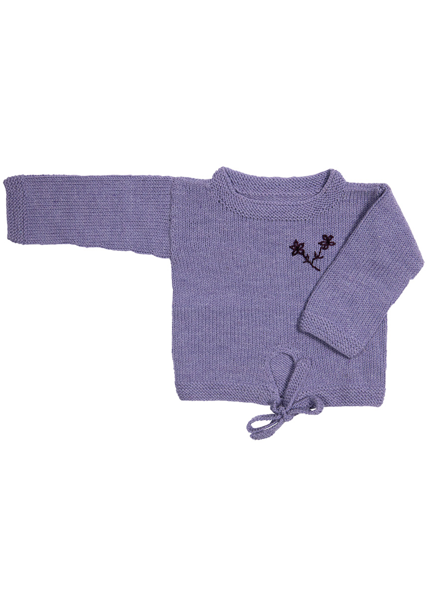 Lana Grossa-kvalitet ”Cool Wool Mélange” (100 % ren ny uld, løbelængde = ca. 160 m / 50 gr.): 100(150-150) gr syren meleret (fv 101) og Lana Grossa-kvalitet ”Cotone” (100 % bomuld), løbelængde = ca. 125 m / 50 gr.): 50 gr brombær (fv 74), strikkepinde nr. 4, strømpepinde nr. 4, rundpind nr. 4, 40 cm, hæklenål nr. 3½.
