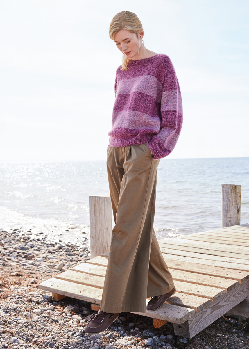 Garn: Lana Grossa Cool Wool Vintage (100 % ren ny ull (merino extrafine), LL = ca. 160 m/50 g), 150 (200 – 200 – 250) g lys grå (frg 7369) og 250 (250 – 300 – 300) g plomme (frg 7365). Lana Grossa Silkhair (70% mohair (superkid), 30% silke, LL = ca. 210 m/25 g), 150 (150 – 175 – 200) g rosa (frg 162) Pinner: Nr. 4,5 og 5, rundpinne (50 cm) nr. 4,5 Info: Strikk genseren med en tråd Cool Wool Vintage sammen med en tråd Silkhair.