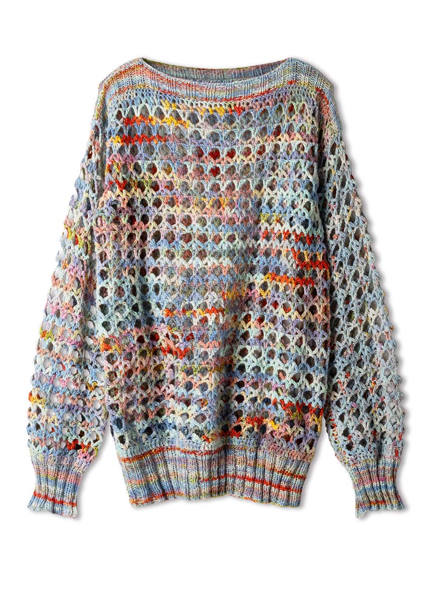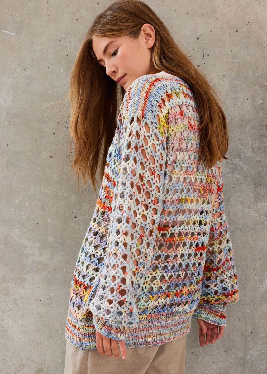 Lana Grossa-kvalitet „Cotonella Multi“ (75 % bomull, 25 % polyacryl, löplängd = ca 270 m/100 g): ca 400 (500 - 500 - 600) g råvit/ljus blå/Zart-/gulgrön/rost färgglad (färg 104); virknål nr. 5, stickor nr. 4,5.