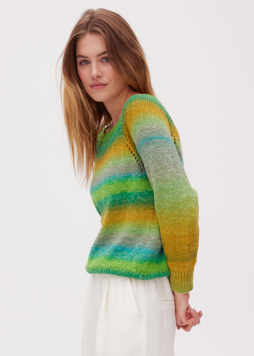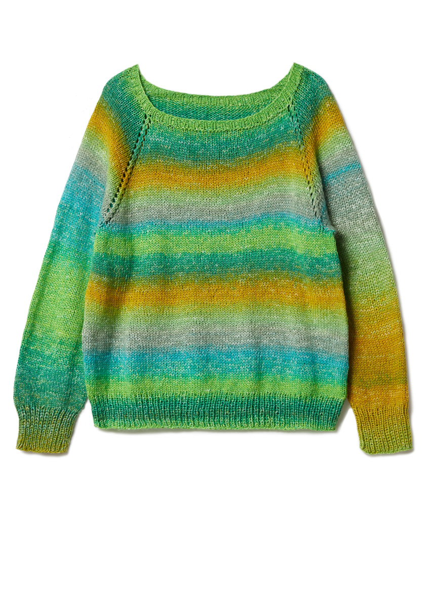 Lana Grossa-kvalitet „Cotonella“ (100% bomull (Pima), löplängd = ca 280 m/100 g): 4 (4 - 4 - 5) nystan = ca 400 (400 - 400 - 500) g turkos/mintgrå/majgrön/curry/ocker/gräsgrön/turkosgrön/ljusgrön (färg 9); kort och långe rundsticka nr. 4 och 4,5; strumpstickor nr. 4 och 4,5. Pullovern stickas uppifrån och ned i ett stycke.