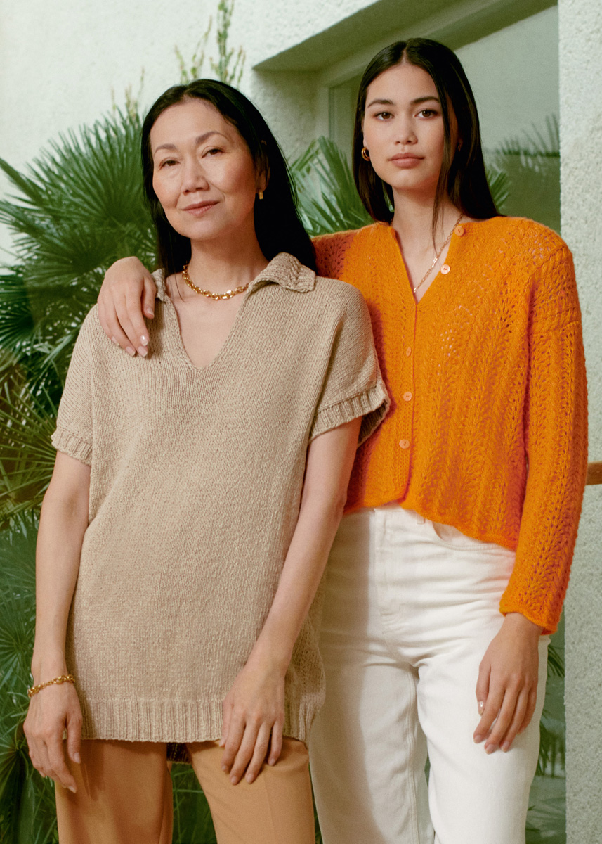 Lana Grossa-kvalitet „Cotton Mélange” (80 % (Mako) bomull, 20 % ren ny ull (Merino extrafine), löplängd = ca. 140 m/50 g): ca. 450 (450 - 500) g beige (färg 14); stickor nr. 4 och 6, 1 rundsticka nr. 4, 40 cm lång.