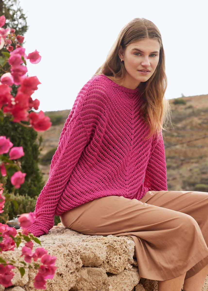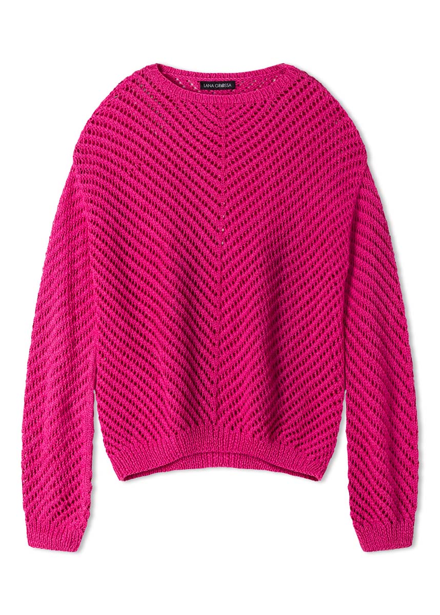 Lana Grossa „Cotton Silk“ (70% bomull, 30% silke, løpelengde 140 m/50 g), 400 (450 - 500 - 550) g i pink (farge 3); pinner nr. 4 og nr. 4,5, 1 rundpinne nr. 4, 50 cm lang.