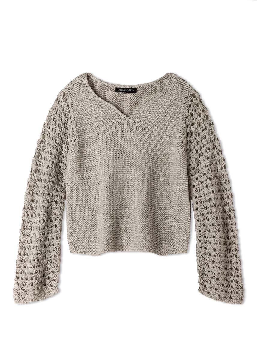 Lana Grossa „Cotton Silk“ (70% bomull, 30% silke, løpelengde 140 m/50 g), 400 (450) g i gråbeige (farge 14); pinner nr. 4.