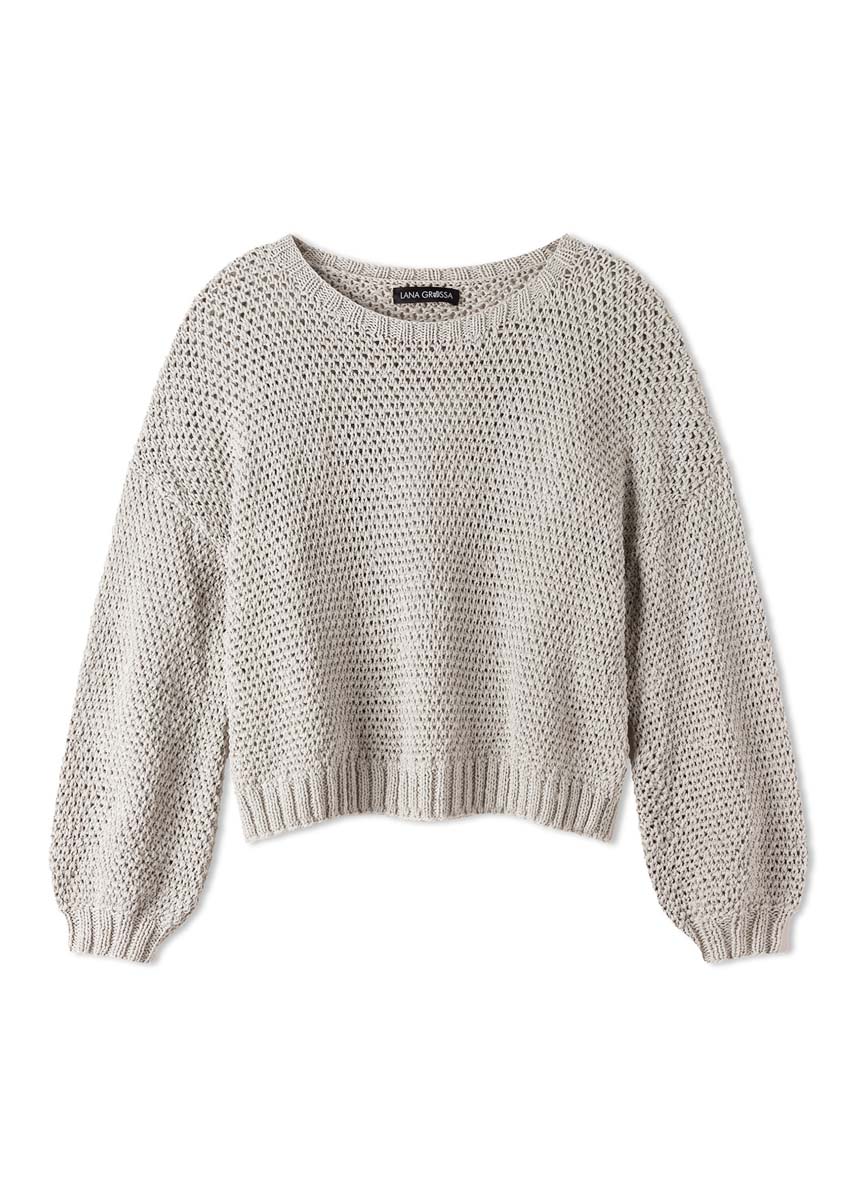 Lana Grossa Summer Cashmere (90% bomull, 10% Kaschmir, løpelenge 210 m/50 g), 300 (350 – 400) g linbeige (farge 9); pinner nr. 3 og 4, samt 1 rundpinne nr. 3, 40 cm lang.