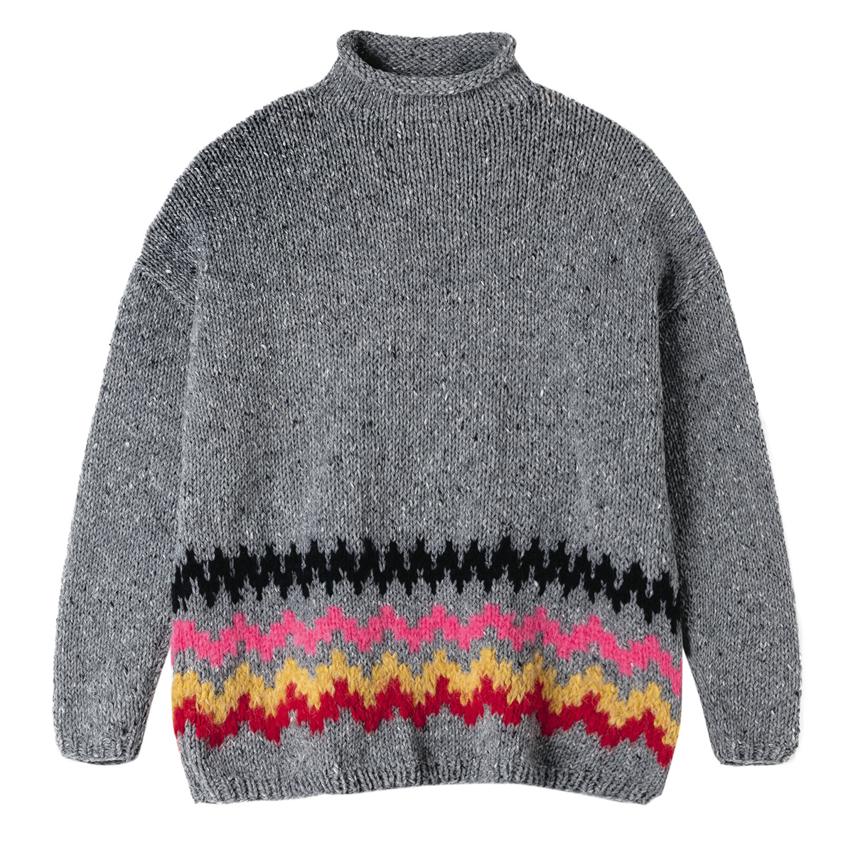 Lana Grossa Country Tweed (100% ren ny ull, löplängd 90 m/50 g), 550 (600 – 650) g grå melerad (färg 4), Lana Grossa Lala Berlin Brushy (42% mohair (superkid) 38% ren ny ull (merino), 20% polyamid, löplängd 135 m/50 g), 50 g pink (färg 13) och 50 g svart (färg 12) och Lana Grossa Lala Berlin Furry (90% alpacka (baby), 10% polyamid, löplängd 75 m/50 g), 50 g gul (färg 3) och 50 g röd (färg 19); stickor nr. 6,5 och 8, samt 1 rundsticka nr. 6,5, 40 cm lång. Obs: Lala Berlin Brushy stickas med dubbla trådar!