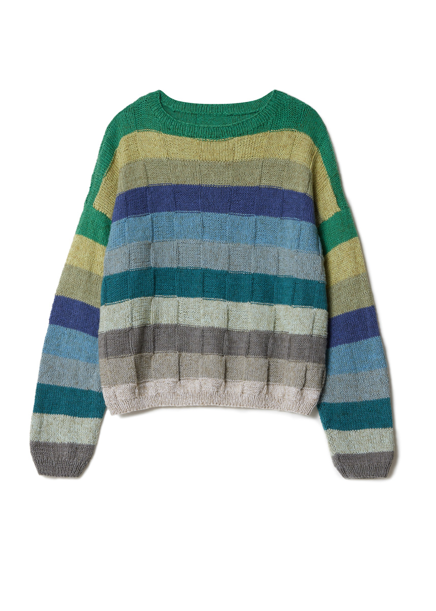 Lana Grossa „Diversa“ (74% bomull, 26% viskos, löplängd = 210 m/50 g) färgvariant A: 50 g var i lin (färg 6), gulgrön (färg 11), ljusgul (färg 13), curry (färg 12), orange (färg 21), terrakotta (färg 4), roströd (färg 22), rosenträ (färg 5), rosabeige (färg 2), bär (färg 3) och plommon (färg 20); färgvariant B: 50 g var i natur (färg 7), ljusgrå (färg 14), mörkgrå (färg 15), mint (färg 9), opalgrön (färg 18), blågrå (färg 8), gråblå (färg 16), bläckblå (färg 17), grågrön (färg 10), gulgrön (färg 11) och gräsgrön (färg 19); stickor nr. 3 och nr. 3,5, 1 rundsticka nr. 3, 40 cm lång.