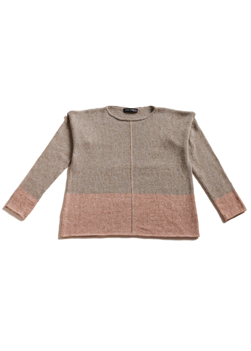 Lana Grossa-kvalitet „Diversa“ (74 % bomull, 26 % viskos, löplängd = ca. 210 m/50 g): ca. 100 (150 - 150) g i rosenträ (färg 5) och 250 (300 - 350) g i ljusgrå (färg 14); stickor nr. 3,5, 1 rundsticka nr. 3,5, 40 cm lång; 1 ullnål.