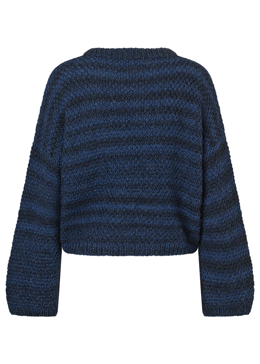 Lana Grossa „Duetto Classico“ (70% ren ny ull (merino fine), 28% alpacka (baby), 2% elasthan, löplängd 100 m/50 g), 500 (550 – 600) g mörk jeans/gråblå/svartblå (färg 11); stickor nr. 5 och 5,5, 1 rundsticka nr. 5, 40 cm lång.