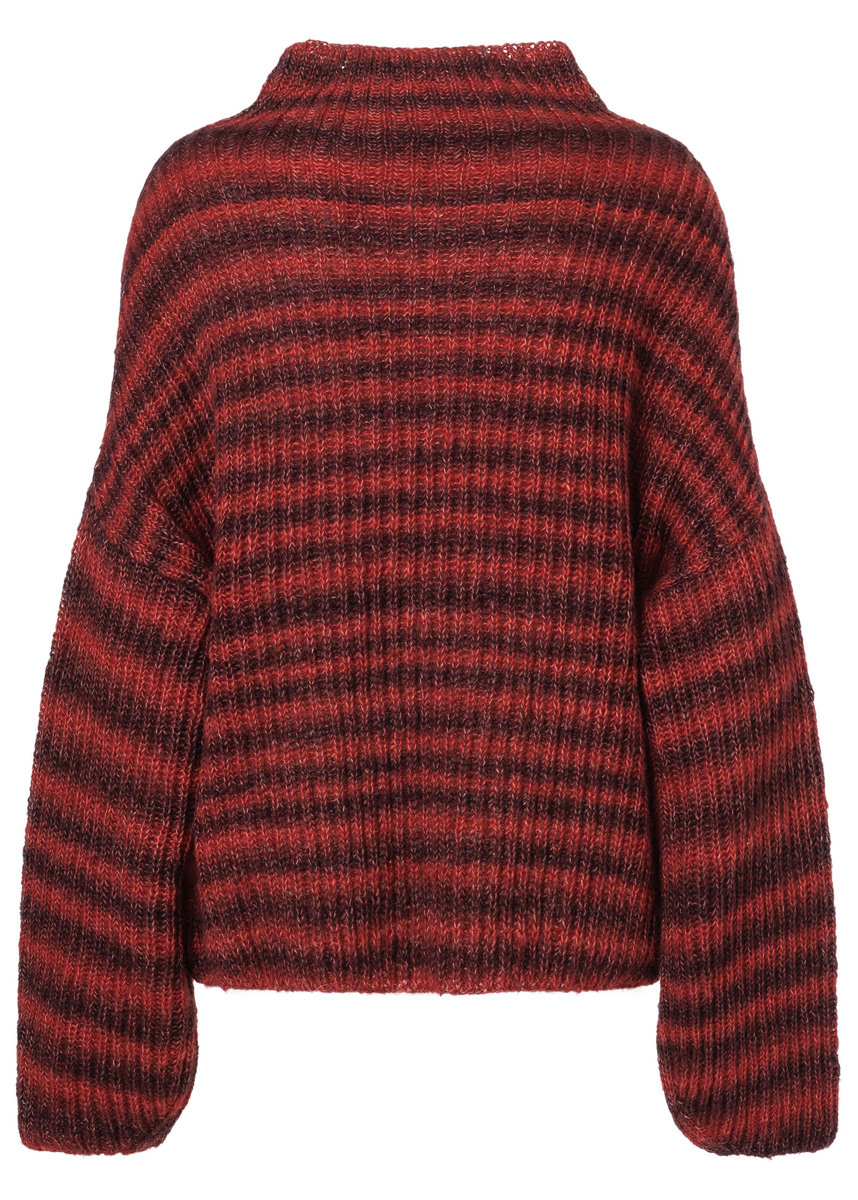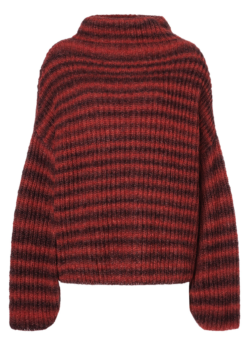 Lana Grossa „Duetto Puno“ (40% alpacka (baby), 38% modal, 22% ren ny ull (merino extrafine), löplängd 230 m/50 g), 400 (450 – 500) g terrakotta/mörk röd/svartröd (färg 103); stickor nr. 3,5 och 1 rundsticka nr. 3,5, 40 cm lång.