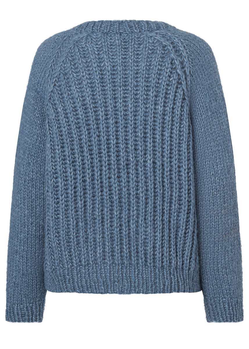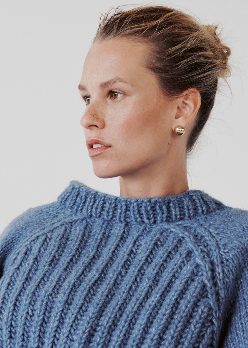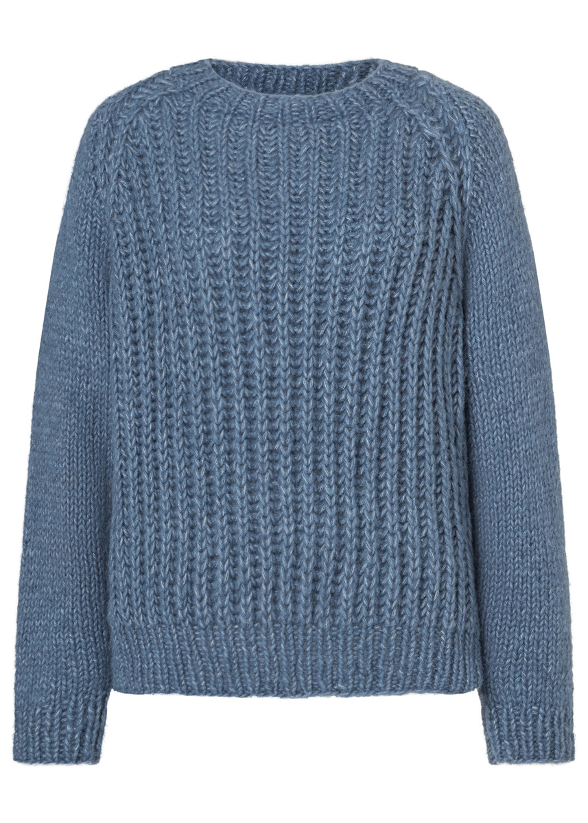 Lana Grossa „Ecopuno Chunky“ (48% bomull, 33% ren ny ull (merino extrafine), 19% alpacka (baby), löplängd 70 m/50 g), 550 (600 – 650) g jeans (färg 123); stickor nr. 7 och 8, 1 rundsticka nr. 7, 40 cm lång.