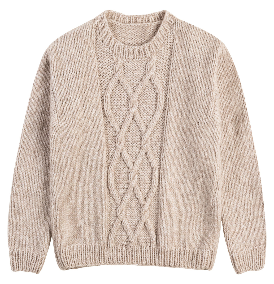 Lana Grossa Ecopuno Chunky (48% bomull, 33% ren ny ull (merino extrafine), 19% alpacka (baby), löplängd 70 m/50 g), 550 (600 – 650) g ljus beige (färg 113); stickor nr. 8 och 10, 1 rundsticka nr. 8, 40 cm lång och 1 flätsticka.