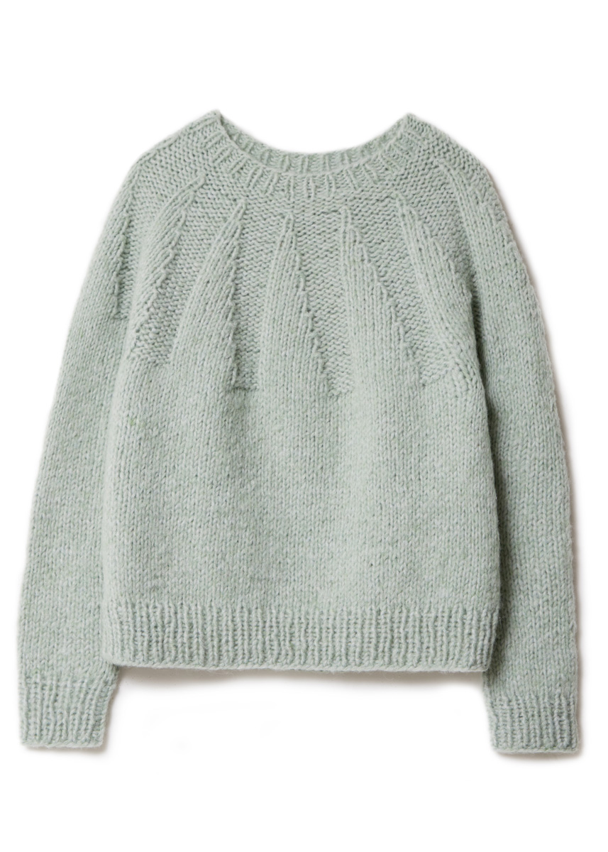 Lana Grossa „Ecopuno Chunky“ (48% bomull, 33% ren ny ull (merino extrafine), 19% alpacka (baby), löplängd 70 m/50 g), 450 (500 – 550) g mint (färg 120); 1 rundsticka nr. 5, 40 och 80 cm lång och rundstickor nr. 6, 40, 60 och 80 cm lång.
