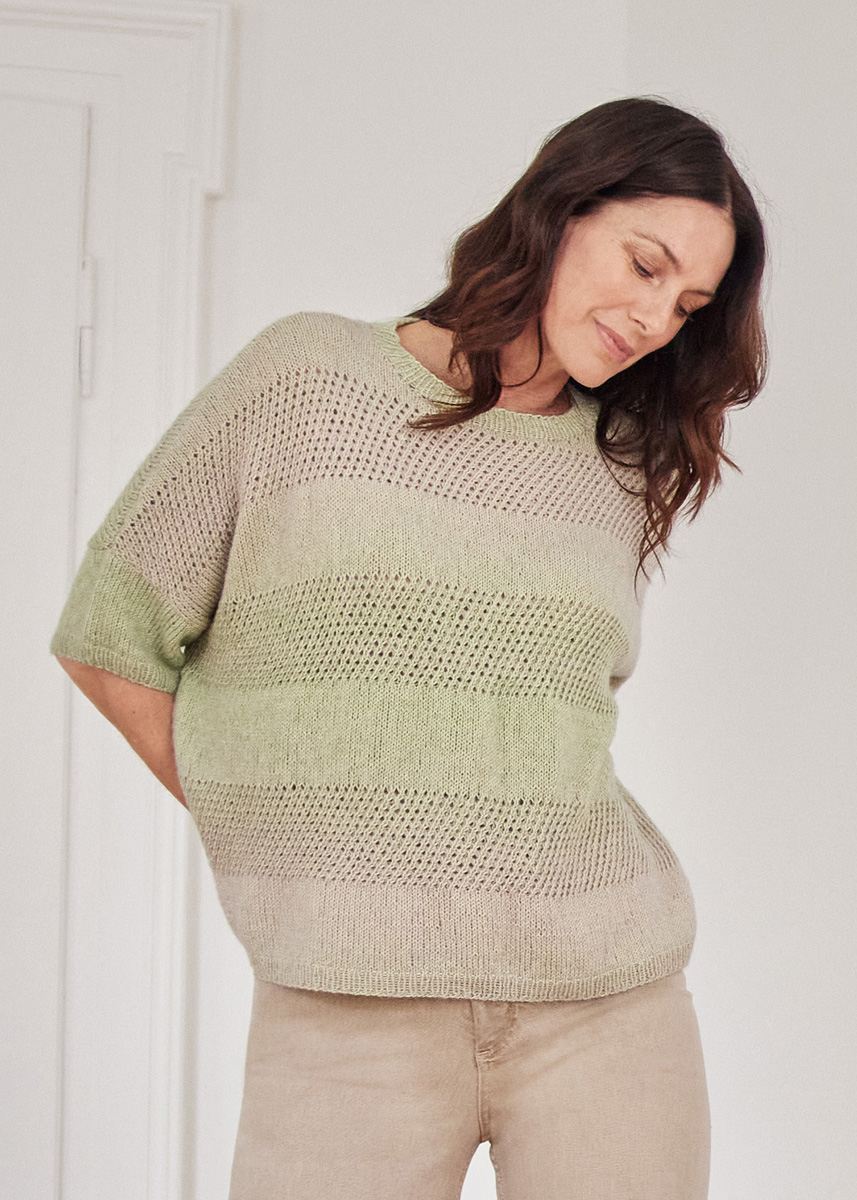 Lana Grossa-kvalitet ”Ecopuno dégradé” (70 % bomuld, 19 % ren ny uld (merino), 11 % (baby) alpaka, løbelængde = ca. 430 m / 100 gr.): ca. 300(400-400) gr lysegrøn/ vanille/lysegrå (fv 405), strikkepinde nr. 2½ og 3½, rundpind nr. 3½, 40 cm.