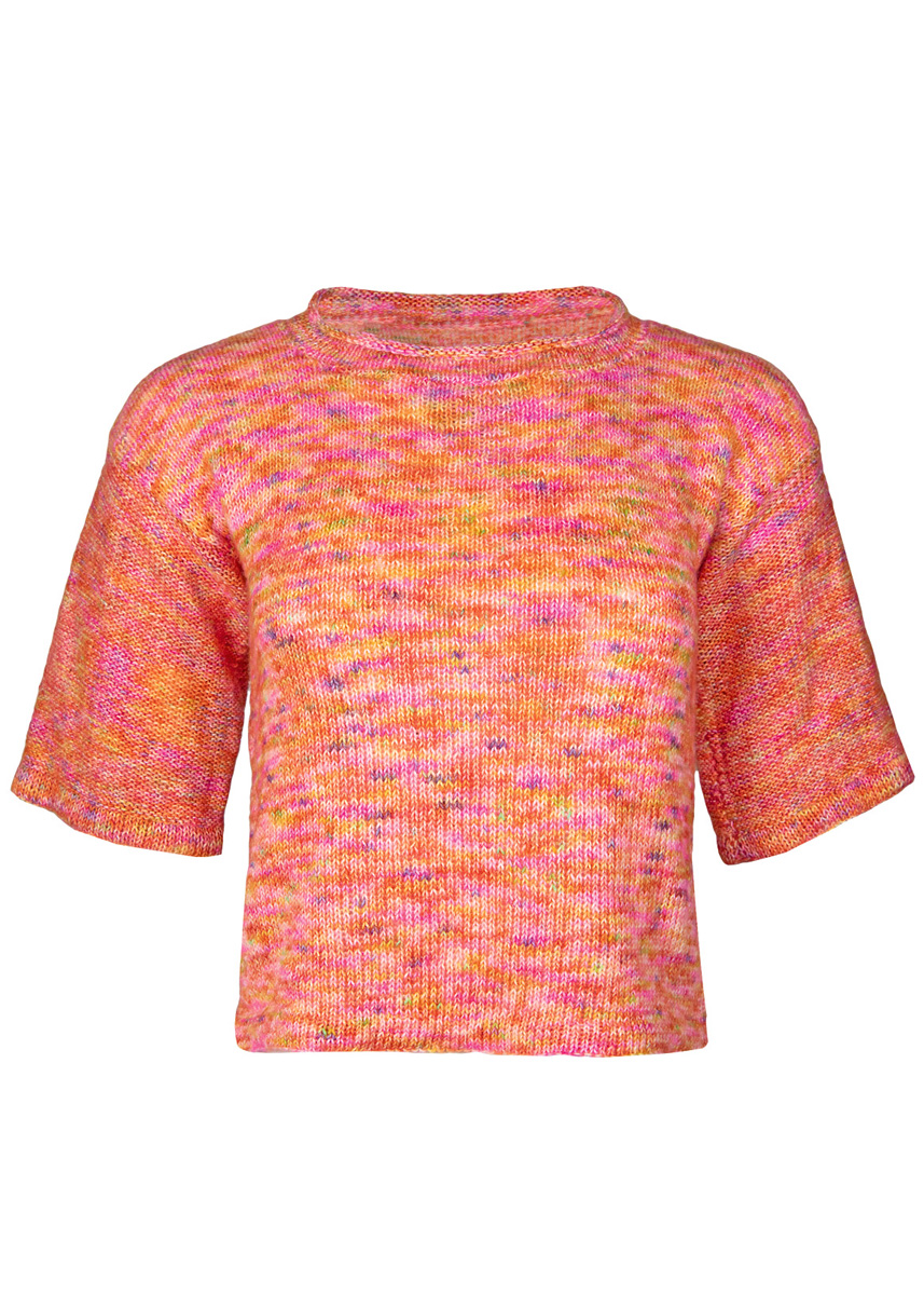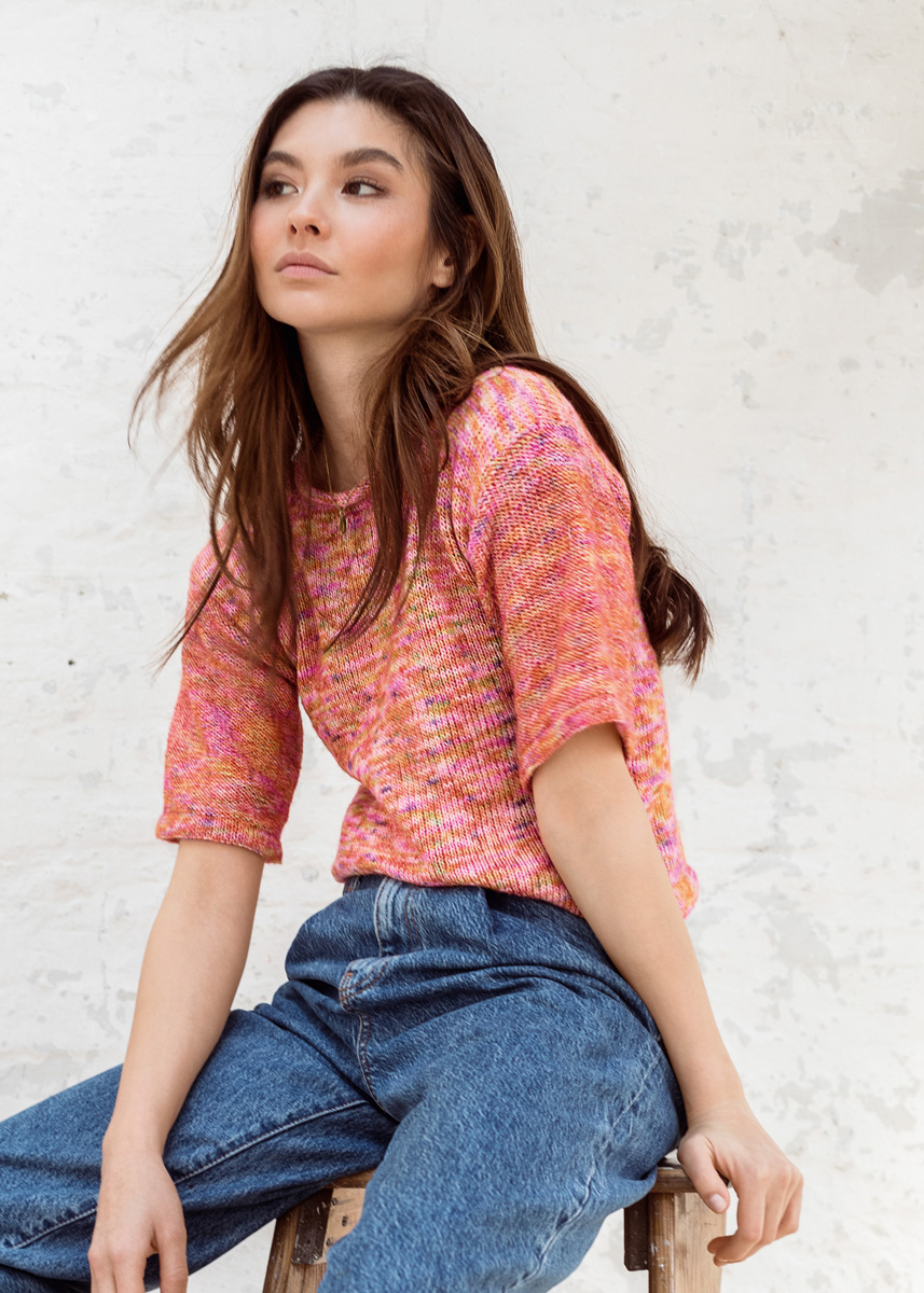 Lana Grossa Ecopuno hand-dyed (72% bomull, 17% ren ny ull merino, 11% baby alpacka, löplängd 215 m/50 g), 250 (300 – 350) g lax/orange/gul/grön/lila/pink (färg 506); stickor nr. 4 och 1 rundsticka nr. 4, 40 cm lång.