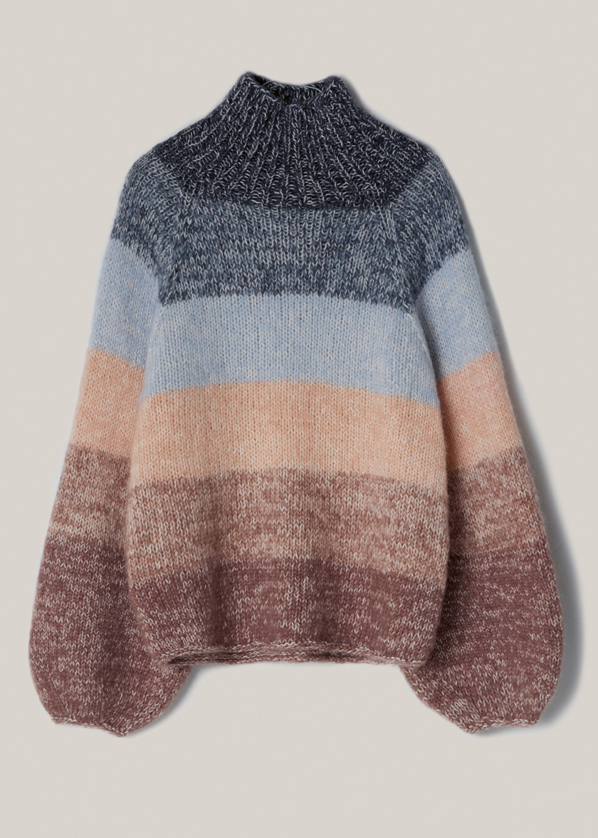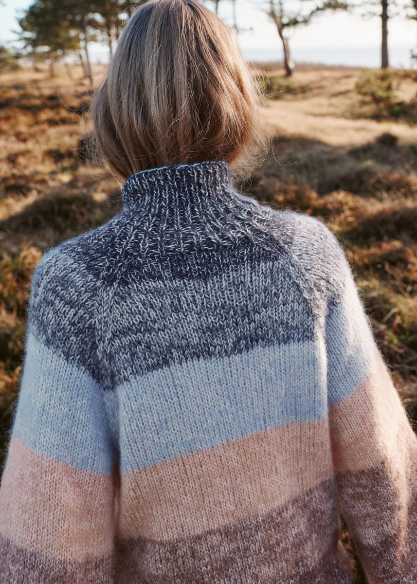 Lana Grossa-kvalitet „Ecopuno” (72 % bomull, 17 % ren ny ull (merino), 11 % (baby) alpacka, löplängd = ca. 215 m/50 g): ca. 200 (250 – 300) g ecru (färg 46) och Lana Grossa-kvalitet „Setasuri” (69 % alpacka (Suri), 31 % silke, löplängd = ca. 212 m/25 g): ca. 100 (125 – 125) g nougat (färg 4), ca. 75 (100 – 100) g persika (färg 3), ca. 50 (75 – 75) g ljusblå (färg 14) och ca. 25 (50 – 50) g grafitblå (färg 12); rundstickor nr. 5, 40 och 60 cm lång, rundstickor nr. 6, 40, 80 och 100 cm lång, strumpstickor nr. 5 och 6. Tips: Alla delar sticas med 3-dubbla trådar, och 1 tråd Ecopuno och 2 trådar Setasuri.