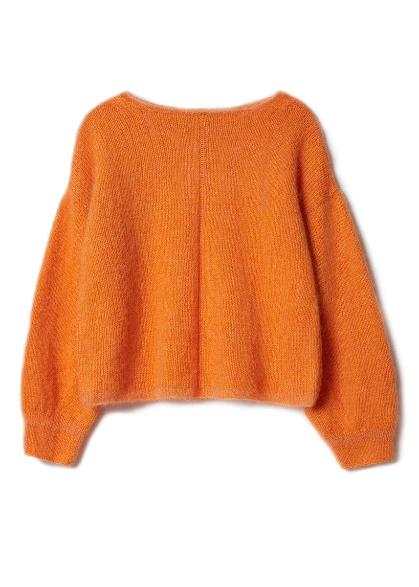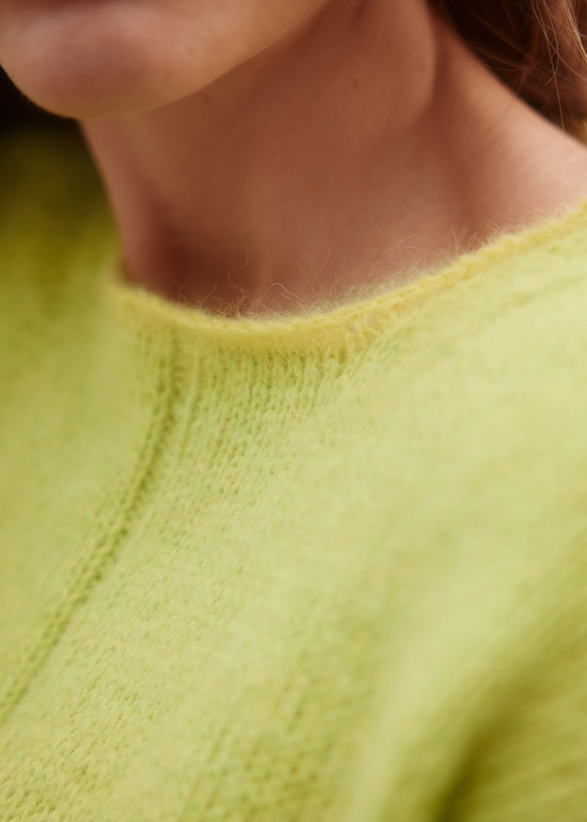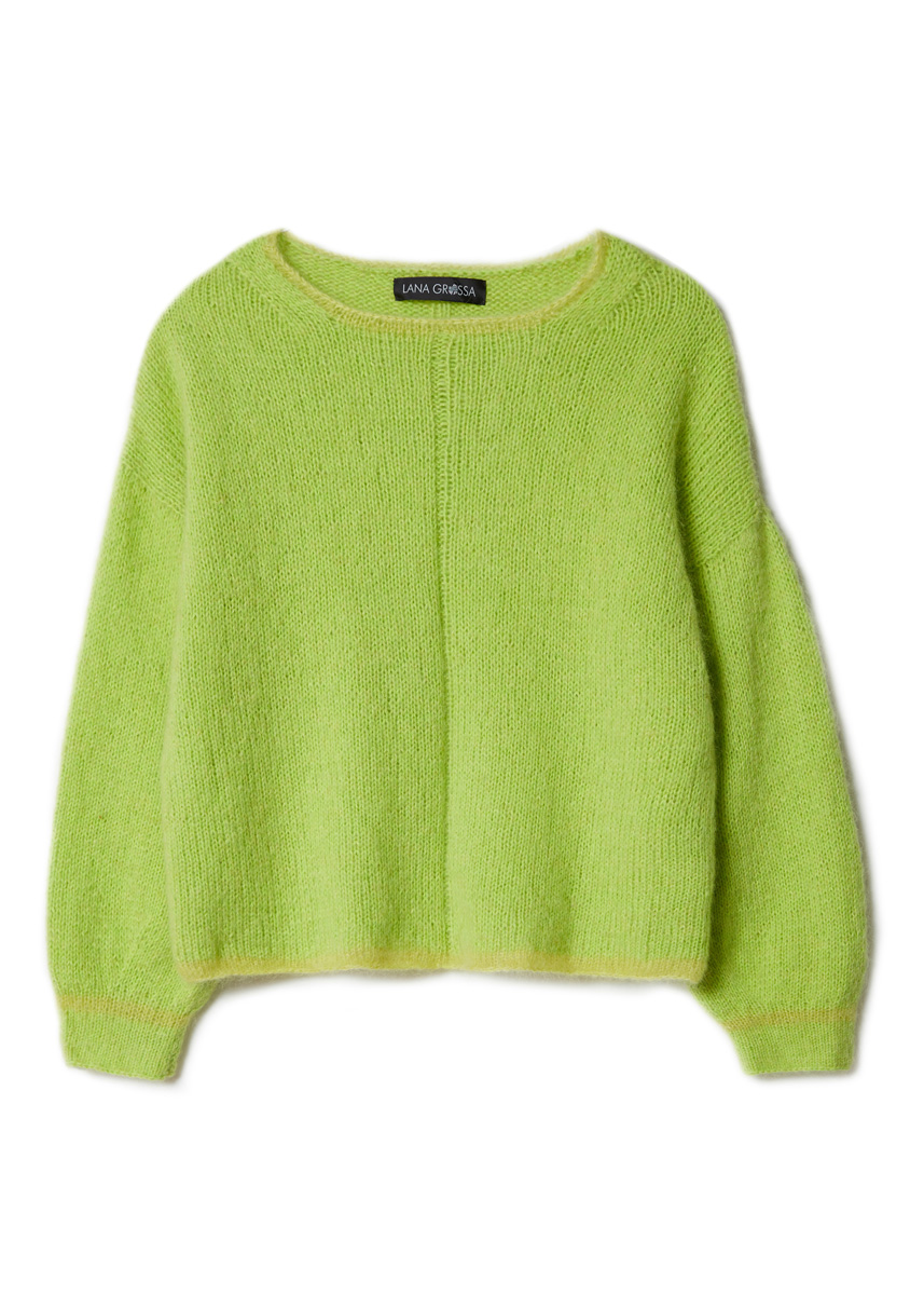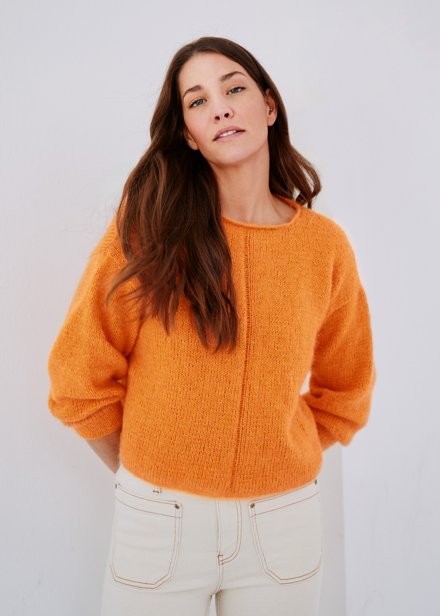 Lana Grossa-kvalitet „Ecopuno“ (72 % bomull, 17 % ren ny ull (merino), 11 % (baby) alpacka, löplängd = ca 215 m/50 g): ca 250 (250 - 300 - 300) g mandarin (färg 72) eller neongrön (färg 96), Lana Grossa-kvalitet „Silkhair“ (70 % mohair (superkid), 30 % silke, löplängd = ca 210 m/25 g): ca 125 (125 - 150 - 150) g pumpa (färg 190) eller gröngul (färg 185); stickor nr 3,5 och nr 4; 1 kort rundsticka nr 3,5.