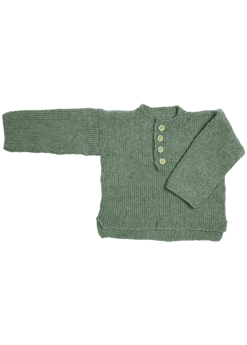 : Lana Grossa-kvalitet ”Ecopuno” (72 % bomuld, 17 % ren ny (merino), 11 % alpaka (baby), løbelængde = ca. 215 m / 50 gr.): ca. 100(100- 150) gr lysegrøn (fv 20), strikkepinde nr. 3½, rundpind nr. 3½, 40 cm, 4 knapper 13 mm Ø.