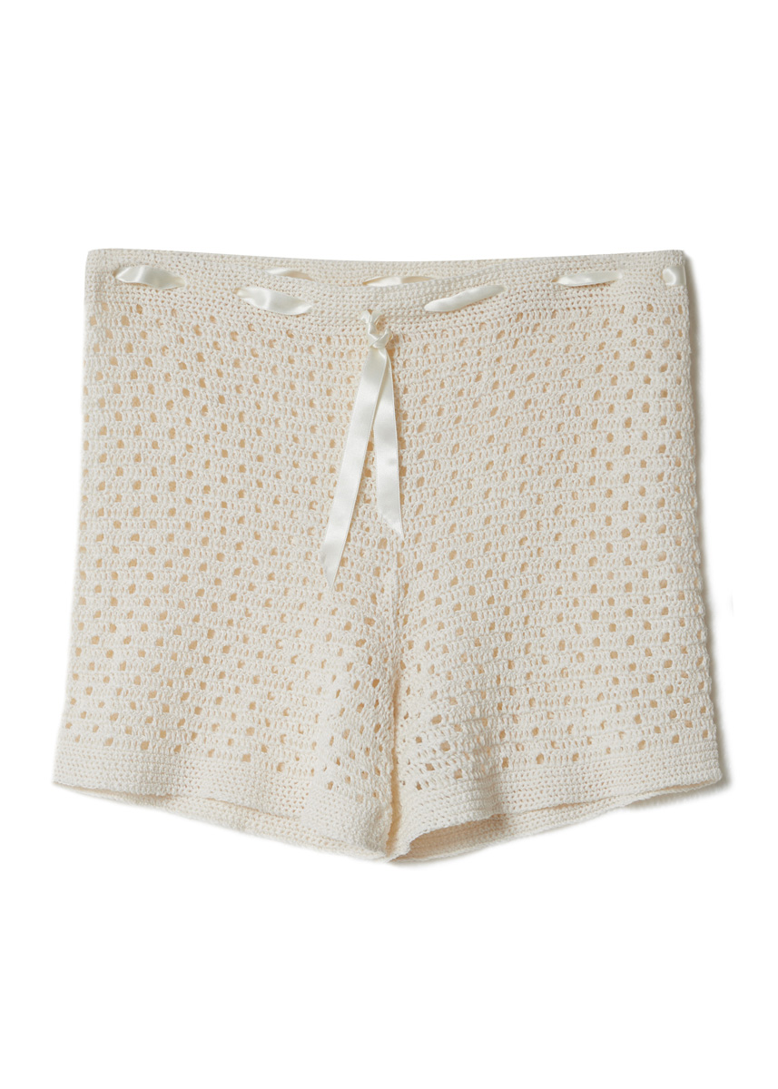Lana Grossa-kvalitet „Nastrino“ (100 % bomuld, løbelængde = ca. 190 m / 50 gr.): ca. 200(250) gr creme (fv 2), hæklenål nr. 3 og 3½, ca. 130(138) cm langt satinbånd i creme, 15 cm bredt.