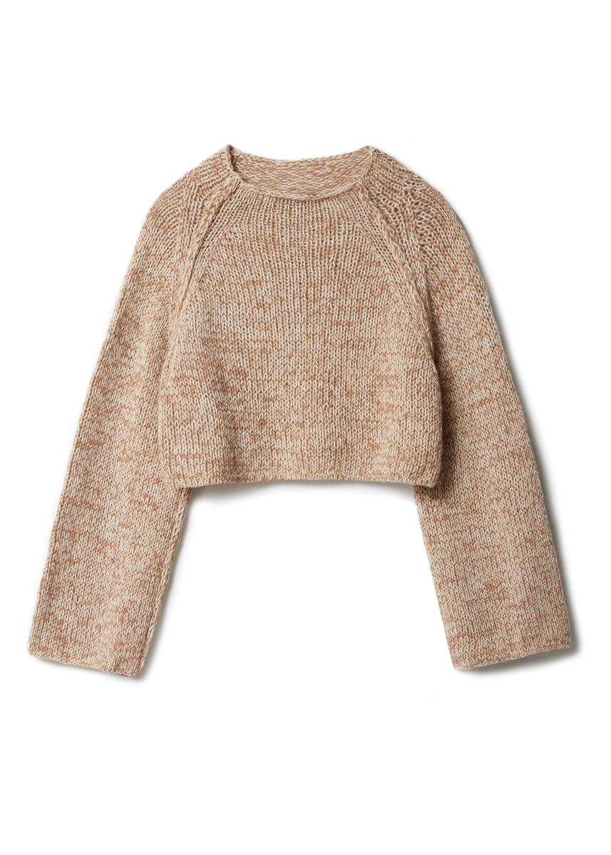 Lana Grossa Ecopuno (72% bomull, 17% ren ny ull (merino), 11% alpacka (baby), löplängd 215 m/50 g), 150 (200 – 200) g karamell (färg 65) och 150 (200 – 200) g pärlbeige (färg 66); stickor nr. 6,5. OBS: Modellen stickas med dubbla trådar, 1 tråd var i karamell och i pärlbeige!