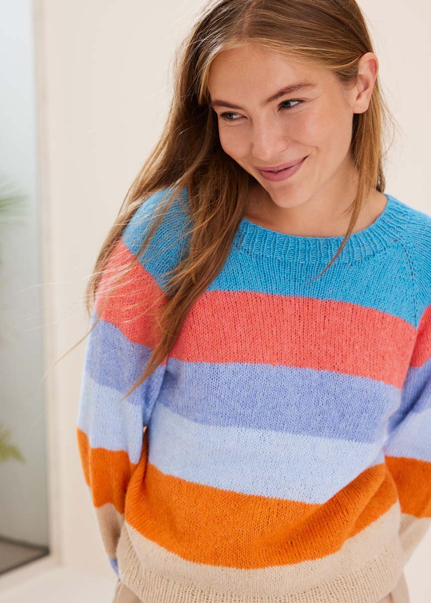 Lana Grossa «Ecopuno» (72% bomull, 17% ren ull (merino), 11% alpakka (baby), LL = ca. 215 m/50 g): ca. 50 (50 - 100 - 100) g asur (frg 85), ca. 50 (50 - 100 - 100) g hummer (frg 90), ca. 100 (100 - 150 - 150) g lys blå (frg 13), ca. 50 (100 - 100 - 100) g pastell blå (frg 207), ca. 50 (100 - 100 - 100) g oransje (frg 89) og ca. 50 (100 - 100 - 150) g perlebeige (frg 66) Pinner: Kort og lang rundpinne nr. 3,5 og nr. 4,5, strømpep nr. 3,5 og 4,5
