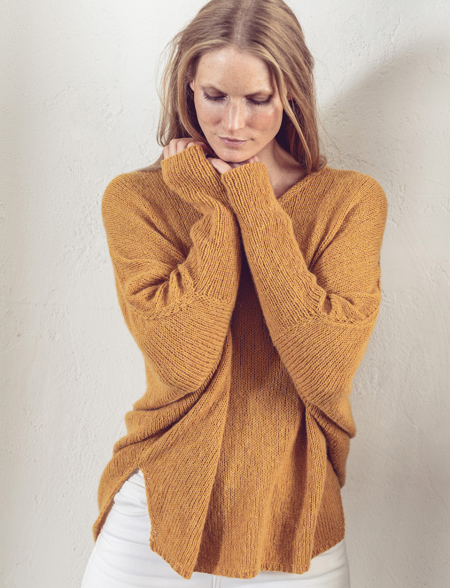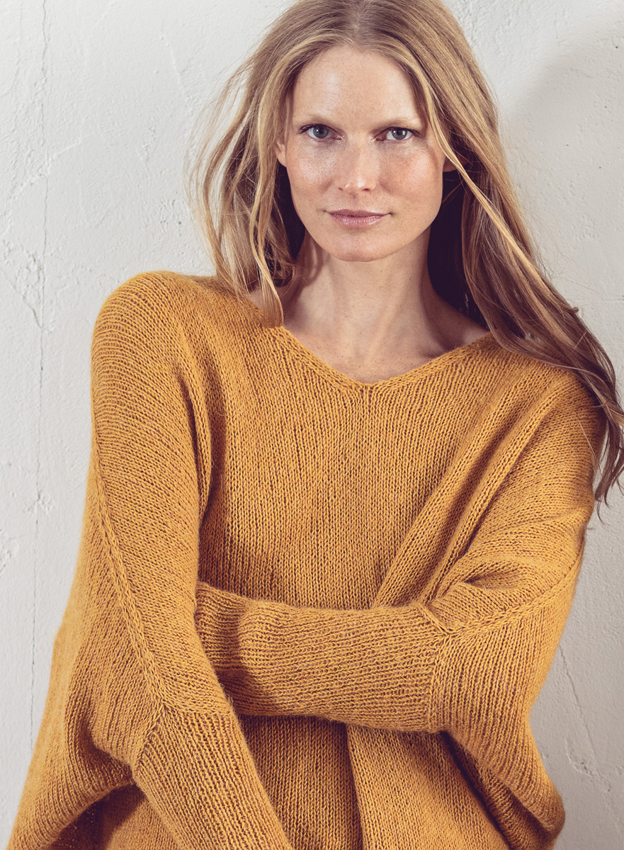 Lana Grossa Ecopuno (72% bomull, 17% ren, ny merinoull, 11% baby alpakka, løpelengde 215 m/50 g), 350 (400 – 450) g guloransje (farge 33); 1 rundpinne nr. 4, 80 cm lang, settpinner nr. 3,5 og 1 heklenål nr. 3,5.