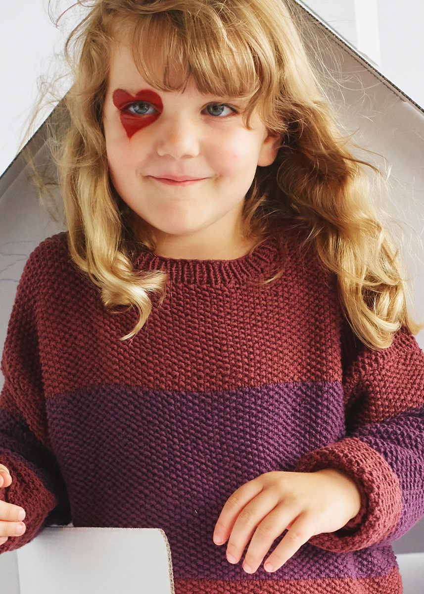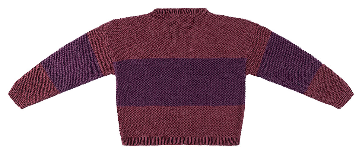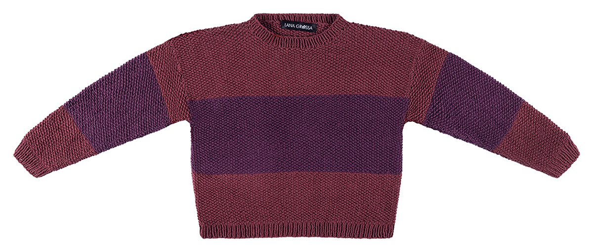 Lana Grossa Elastico (96% bomull, 4% polyester, löplängd 160 m/50 g) 200 (250 – 300) g marone (färg 152) och 150 (200 – 200) g björnbär (färg 151); stickor nr. 3, 5 och 4, 1 rundsticka nr. 3, 5, 40 cm lång,
