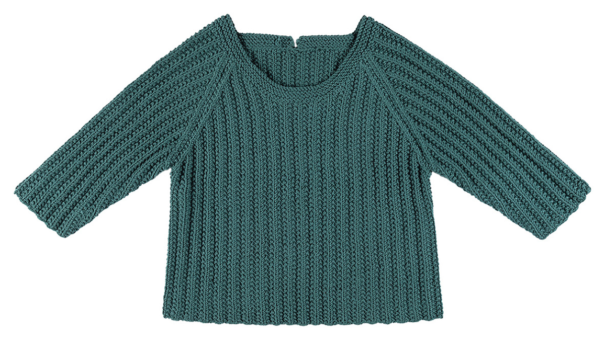 Lana Grossa Elastico (96% bomull, 4% polyester (Elité), löplängd 160 m/50 g), 250 (250 – 300) g mörk grön (färg 147); stickor nr. 3, 5 och 1 rundsticka nr. 3, 40 cm lång.