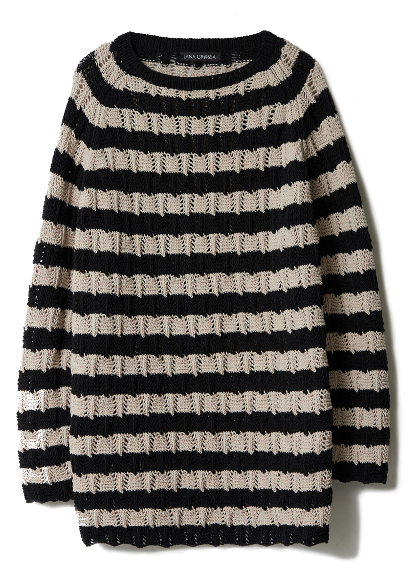 Lana Grossa Elastico (96% bomull, 4% polyester (Elité), löplängd 160 m/50 g), 350 (400 – 450) g svart (färg 24) och 300 (350 – 400) g beige (färg 97); stickor nr. 3,5 och 1 rundsticka nr. 3, 40 cm lång.