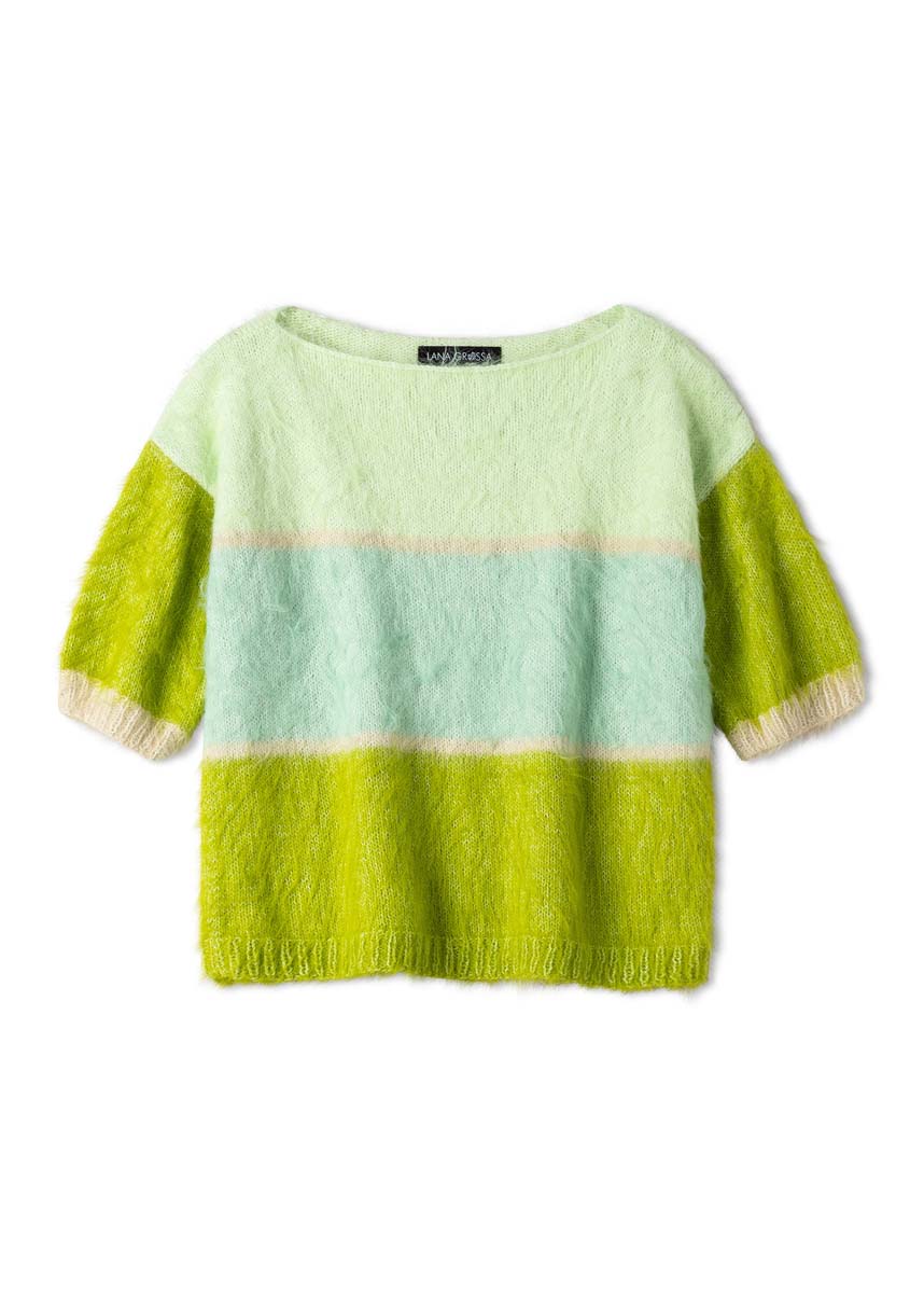 Lana Grossa „Finito“ (73% bomull, 27% polyamid, løpelengde 150 m/50 g), 150 (200 - 200 - 200) g i pistasj/creme (farge 5), 100 (100 - 100 - 150) g i mykgrønn/creme (farge 4), 100 (100 - 100 - 150) g i lime/creme (farge 6) og 50 g i lys beige/creme (farge 8); pinner nr. 4.