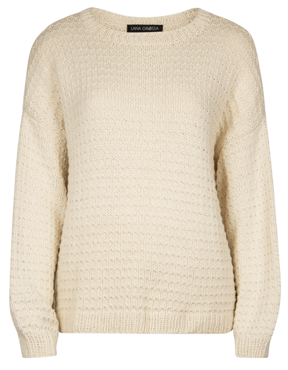 Lana Grossa-kvalitet „Fourseason” (45 % (bio) ren ny ull (extrafin merino), 40 % (bio) bomull, 15 % återvunnen kashmir, löplängd = ca. 105 m/50 g): ca. 450 (500 – 550) g råvit (färg 12); stickor nr. 5 och 6, 1 rundsticka nr. 5, 50 cm lång.