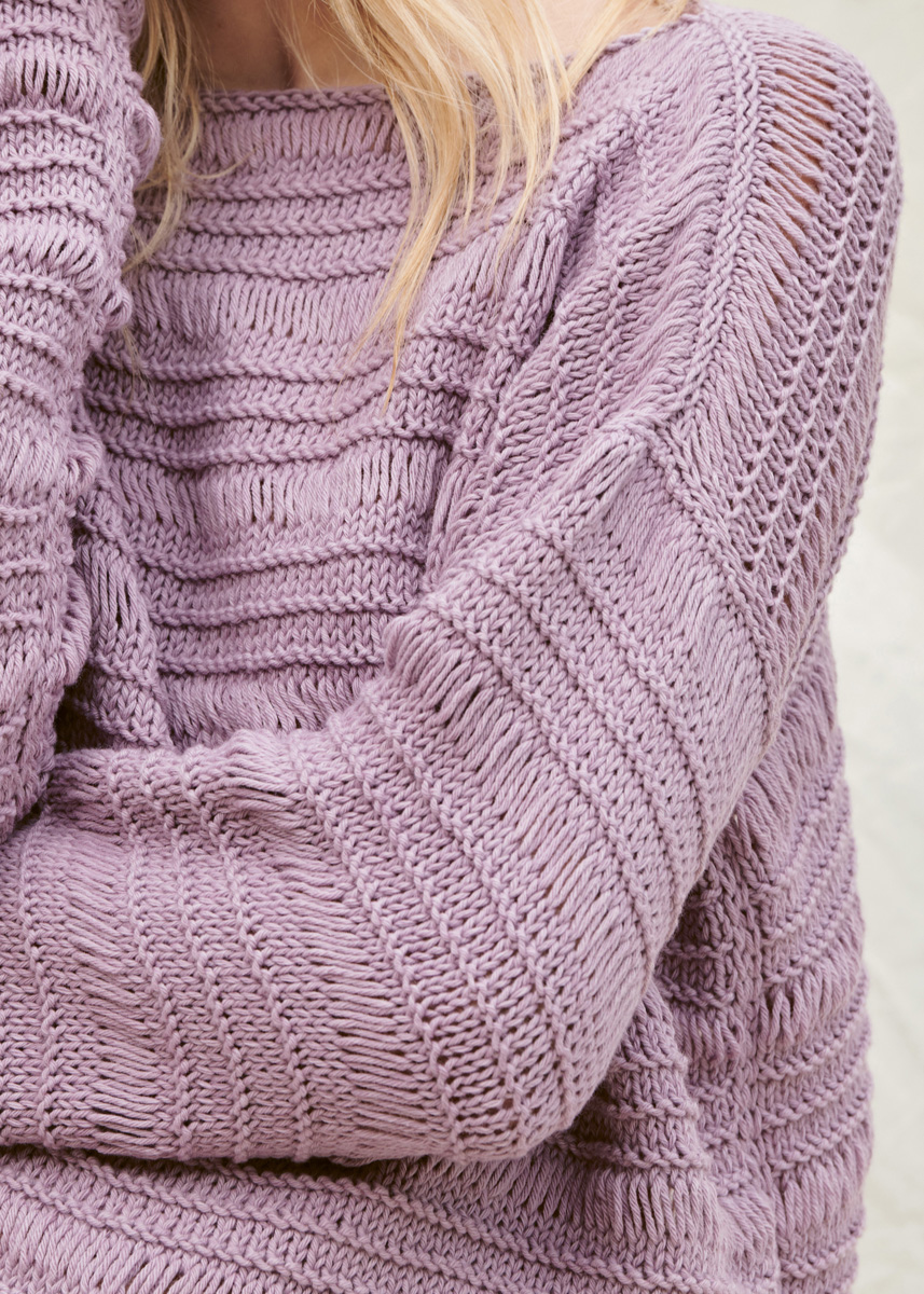 Lana Grossa-kvalitet „Fourseason” (45 % ren ny ull bio (merino extrafin), 40 % bio bomull, 15 % återvunnen kashmir, löplängd = ca. 105 m/50 g): ca. 400 g [8 nystan] grålila (färg 17); stickor nr. 5,5.