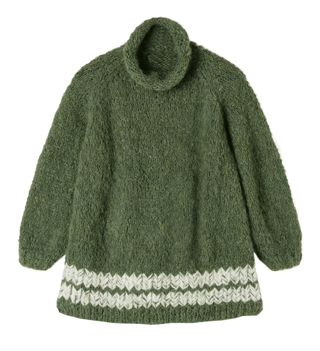 Lana Grossa Lala Berlin Furry (90% alpacka (baby), 10% polyamid, löplängd 75 m/50 g), 500 (550 – 600) g mossgrön (färg 22) och 50 g råvit (färg 1); stickor nr. 6 och 8, samt 1 rundsticka nr. 8, 40 cm lång och 1 ullnål.