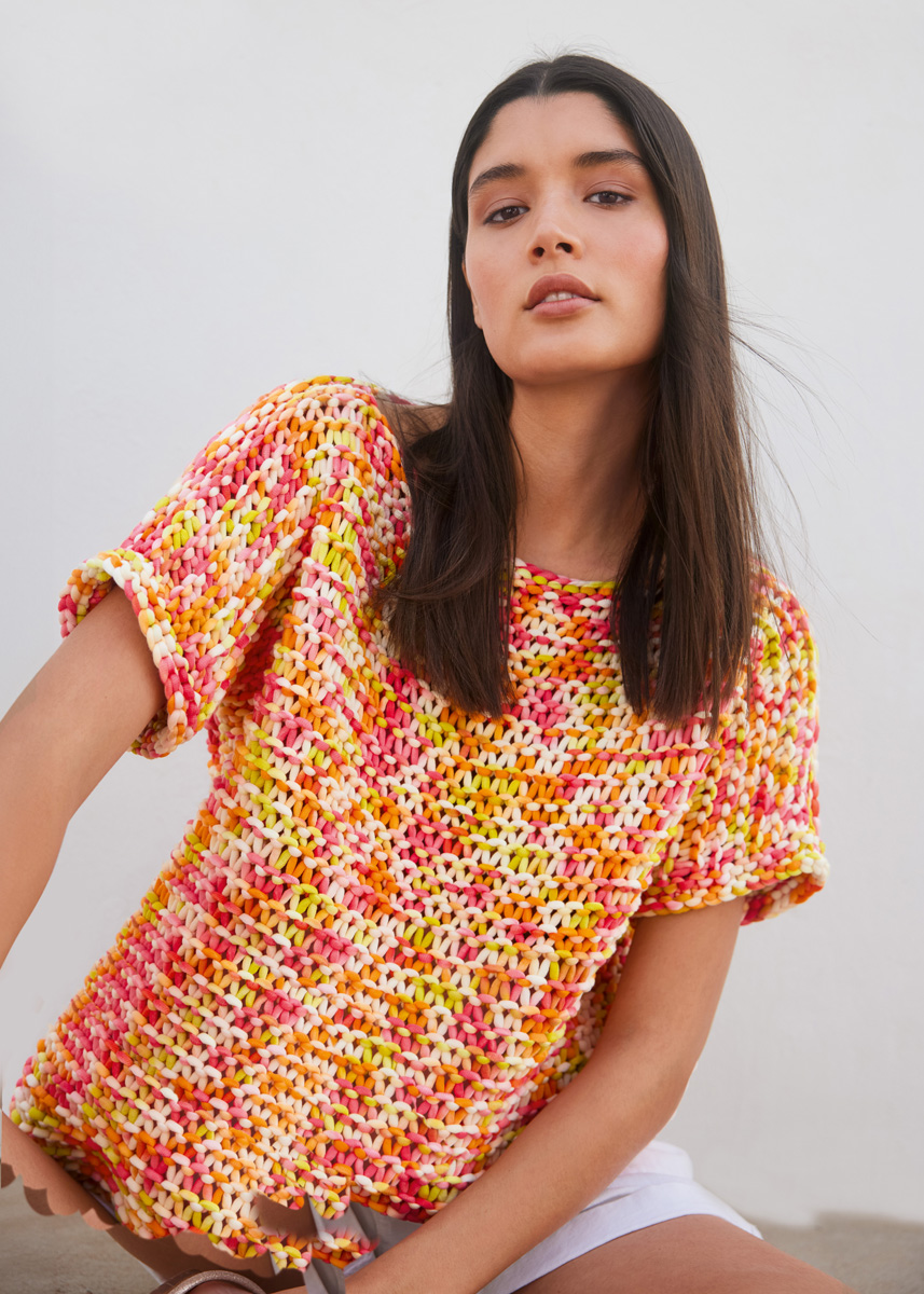 Lana Grossa Gelato (52% bomull, 48% återvunnen polyamid, löplängd 80 m/100 g), 500 (600 – 700) g creme/ rosa/orange/pink/citrusgul (färg 2); stickor nr. 8 och 9.