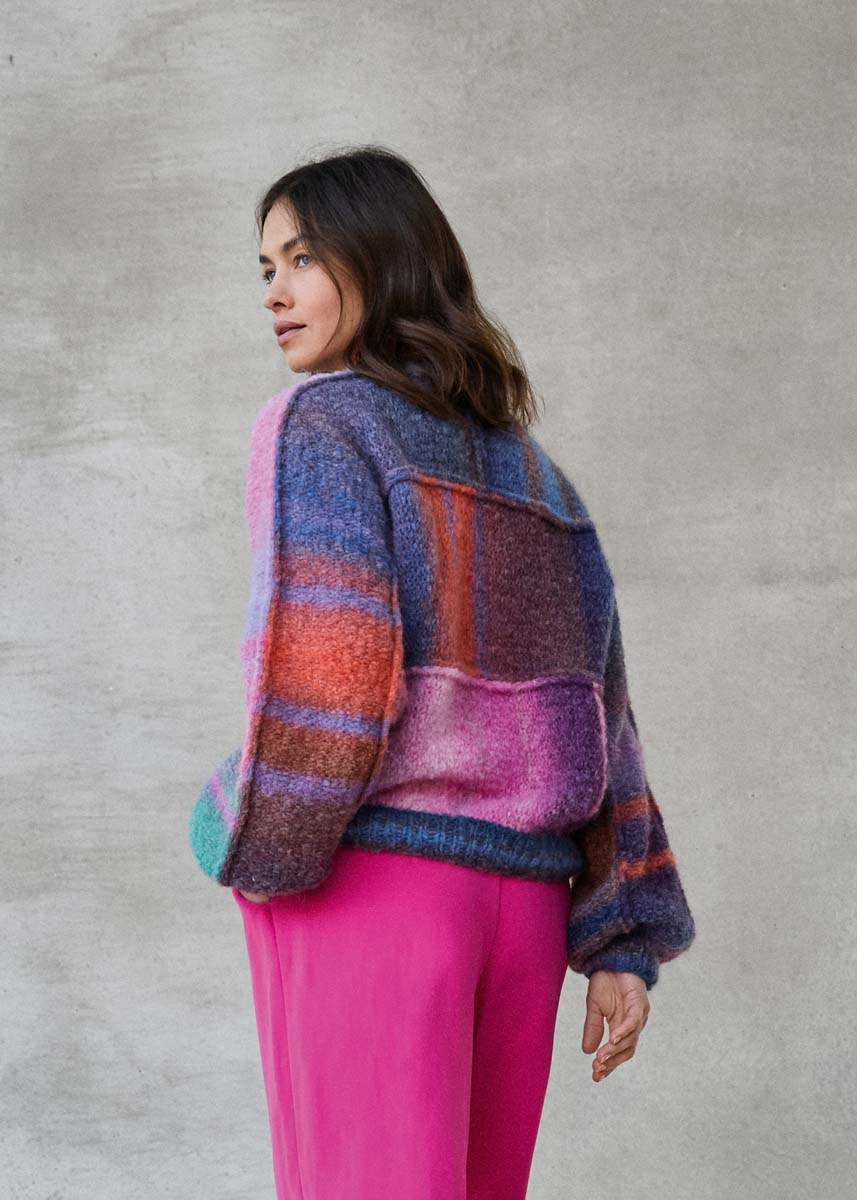 Lana Grossa «Gigante Multi» (70 % alpakka (fine), 30 % polyamid, LL = ca. 150 m/50 g): ca. 200 (250 - 300 - 350) g gråbrun/petrolblå/madarin/grårød/mørk fiolett/lilla (frg 102) og 100 (150 - 150 - 200) g mauve/nellik/pink/jadegrønn/grå-/ vinrød/bjørnebær/fiolblå (frg 107) Pinner: Nr. 6, strømpepinner nr. 5 og lang rundpinne nr. 5